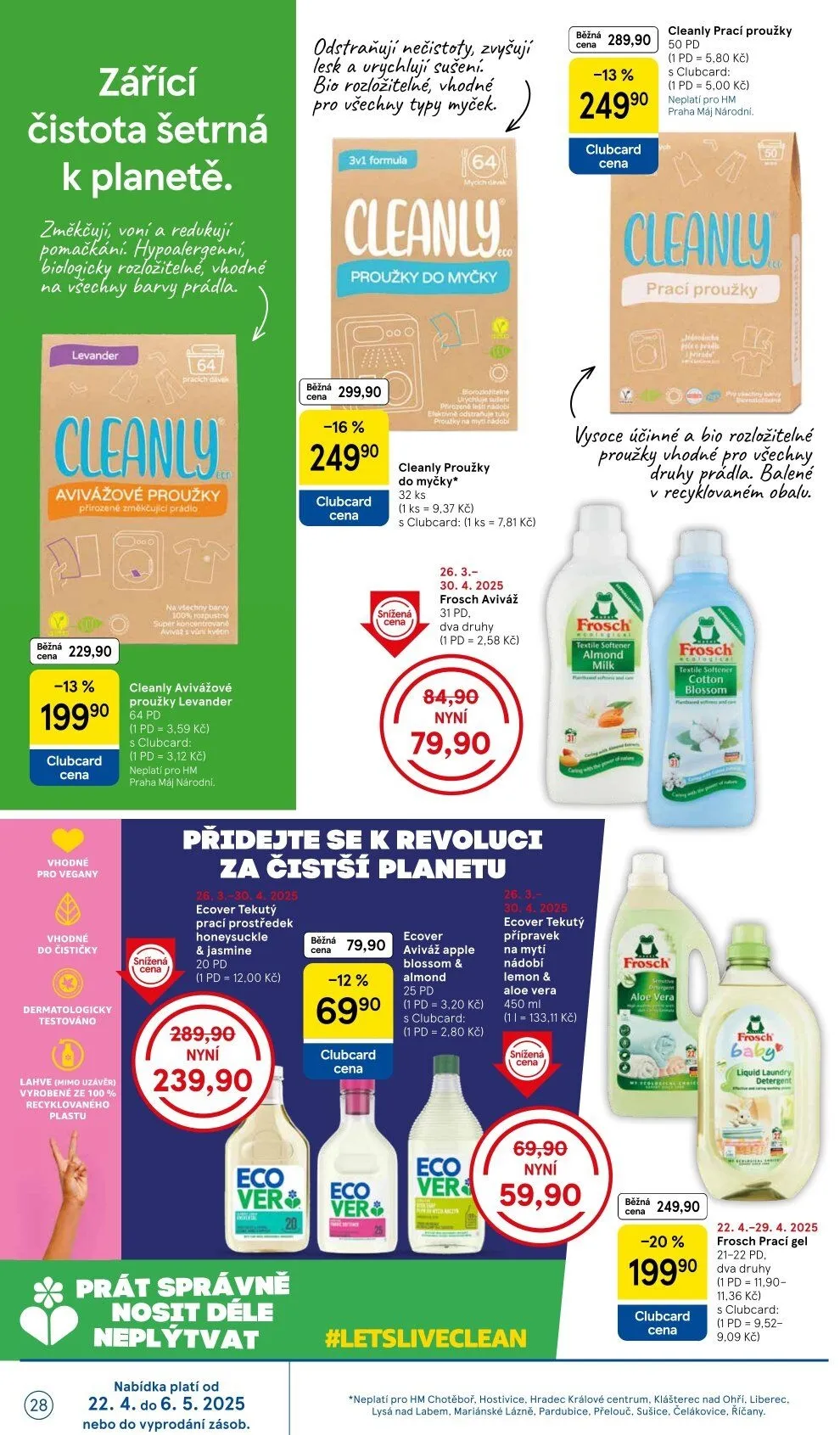 V letáku obchodu Tesco najdete širokou nabídku ekologických a šetrných produktů pro domácnost. Mezi nimi jsou například prací proužky Cleanly, které jsou vysoce účinné a bio rozložitelné, ideální pro všechny typy praček. Aviváže Frosch, jako je Almond Milk a Cotton Blossom, jsou dermatologicky testované a vyrobené z recyklovaných materiálů, vhodné pro vegany.