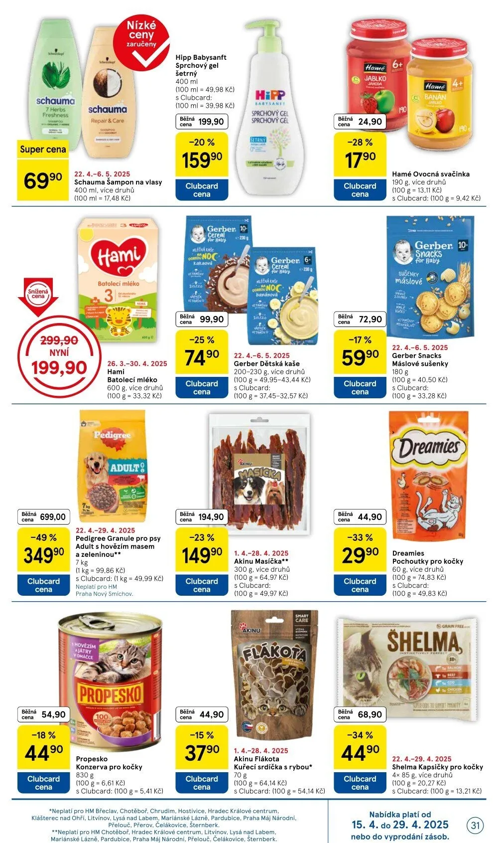 V letáku obchodu Tesco najdete širokou nabídku produktů za nízké ceny. Mezi nimi je například šetrný sprchový gel Hipp Babysanft o objemu 400 ml, který je nyní za cenu 199,90 Kč. Dále nabízíme Schauma šampon na vlasy, také 400 ml, za skvělou cenu 199,90 Kč. Pro malé děti máme Hami batolecí mléko 600 g za 699,00 Kč.