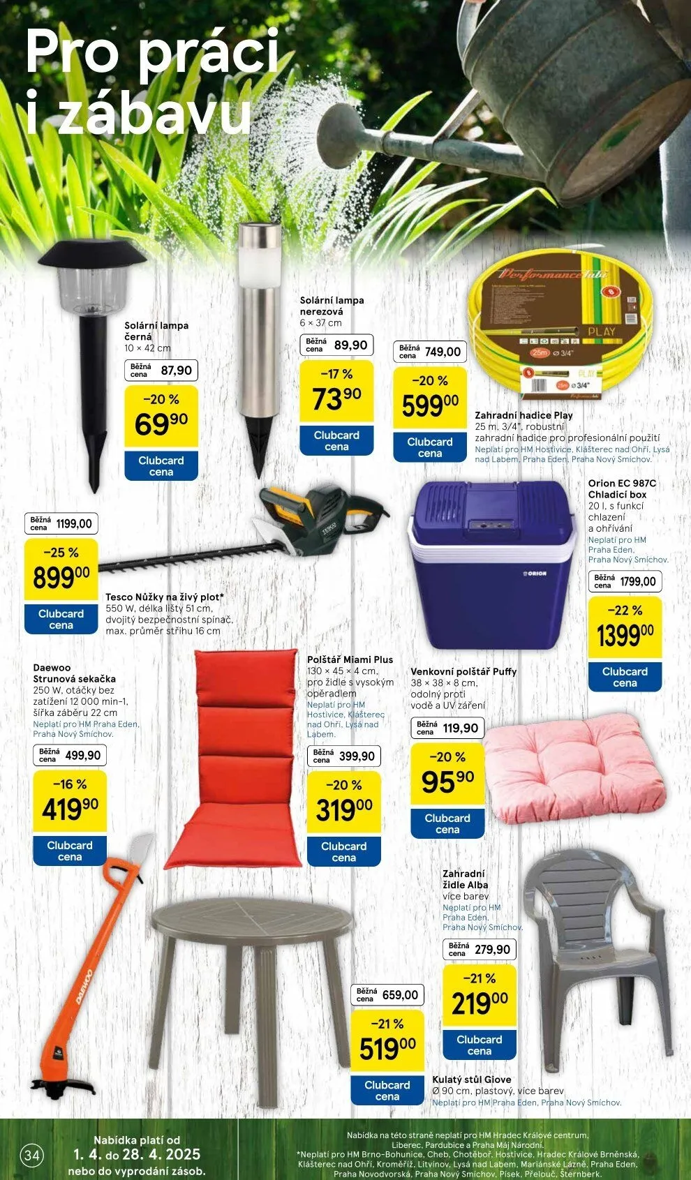 V letáku obchodu Tesco najdete širokou nabídku produktů se slevami. Mezi nimi je solární lampa z nerezové oceli za 89,90 Kč, nyní se slevou 17 %. Dále nabízíme polštář Miami Plus pro židle, který je nyní za 319,00 Kč se slevou 20 %.