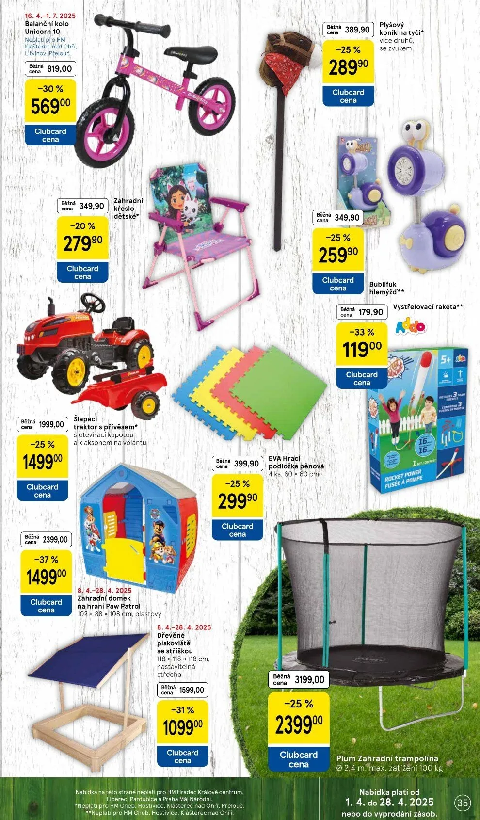 V letáku obchodu Tesco najdete širokou nabídku produktů se skvělými slevami. Například plyšový koník na tyči je nyní za cenu 1 499,00 Kč, což je sleva 25 %. Dále nabízíme traktor s přívěsem, který má otevírací kapotu a klakson, za 1 499,00 Kč se slevou 37 %. Pro děti je také k dispozici dřevěné pískoviště se stříškou za 1 099,00 Kč, což představuje slevu 31 %. Nezapomeňte také na zahradní trampolínu s maximálním zatížením 100 kg, která je v akci. Všechny ceny platí do vyprodání zásob. Navštivte nás a využijte těchto skvělých nabídek!