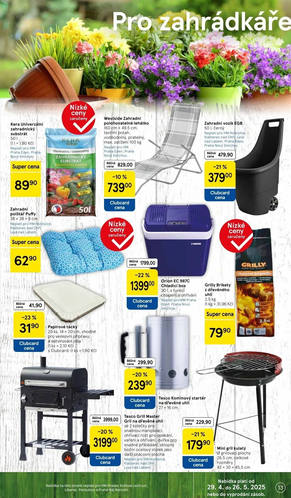 V letáku obchodu Tesco najdete širokou nabídku zahradnických produktů a grilování. Mezi nejzajímavější položky patří zahradnický substrát za super cenu 41,90 Kč a zahradní polštář Puffy za 629 Kč. Pro pohodlné lenošení doporučujeme polohovatelné lehátko Westside za 739 Kč.