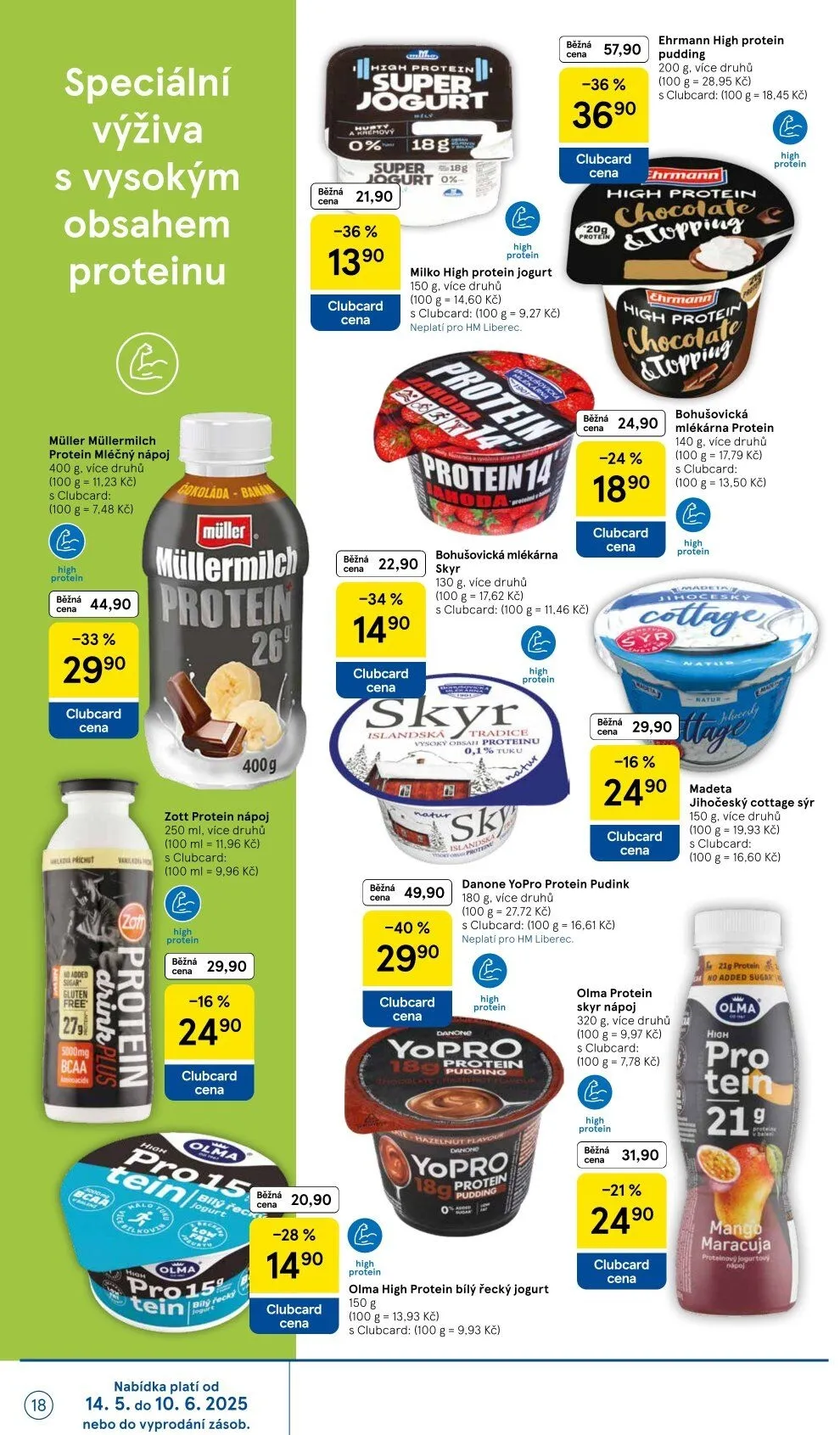 V letáku obchodu Tesco najdete širokou nabídku produktů se zvýšeným obsahem proteinu. Mezi nimi je Müller Müller Milch protein mléčný nápoj o hmotnosti 400 g, který je k dispozici v několika druzích za cenu 57,90 Kč, nyní se slevou 36 %. Dále nabízíme Ehrmann High Protein puding 200 g, jehož cena s Clubcard činí 18,45 Kč za 100 g.