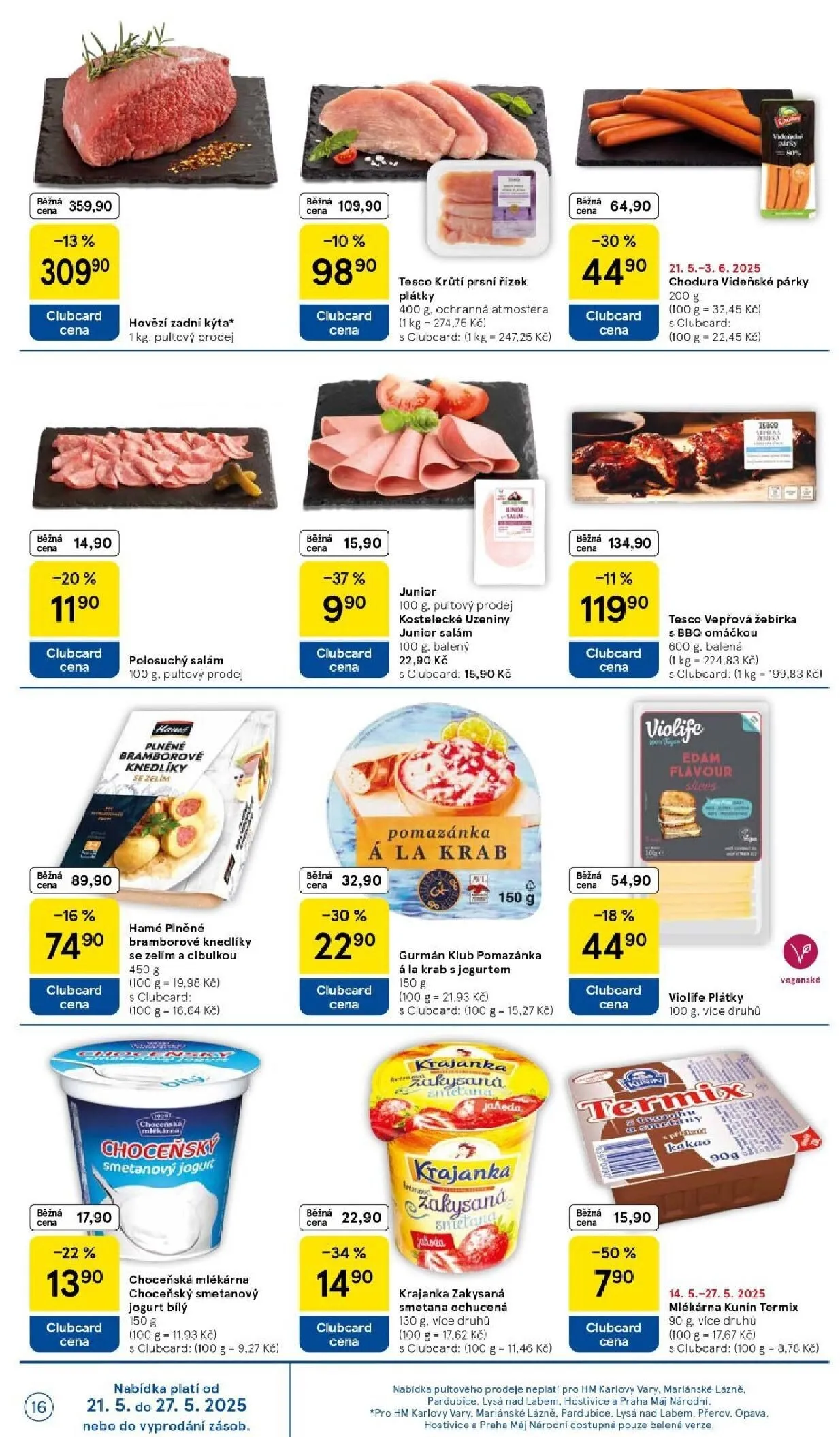 V letáku obchodu Tesco najdete širokou nabídku produktů za skvělé ceny. Například hovězí zadní kýta je nyní za 309,90 Kč/kg, což je sleva 13 %. Pro milovníky uzenin máme polosuchý salám za 14,90 Kč/100 g, se slevou 20 %.