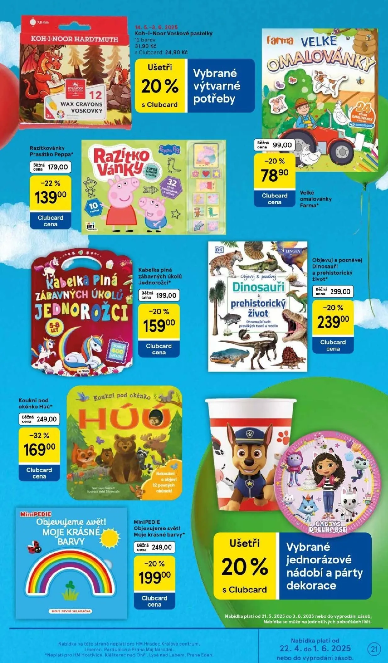 V letáku obchodu Tesco najdete širokou nabídku výtvarných potřeb a zábavných produktů pro děti. Mezi nejzajímavější položky patří voskové pastelky Koh-i-noor v 12 barvách za 31,90 Kč, které jsou nyní se slevou 20 % pro držitele Clubcard. Dále si můžete pořídit razítka s motivem Prasátka Peppy za 139,00 Kč, nebo velké omalovánky s tématem farmy za 78,90 Kč.