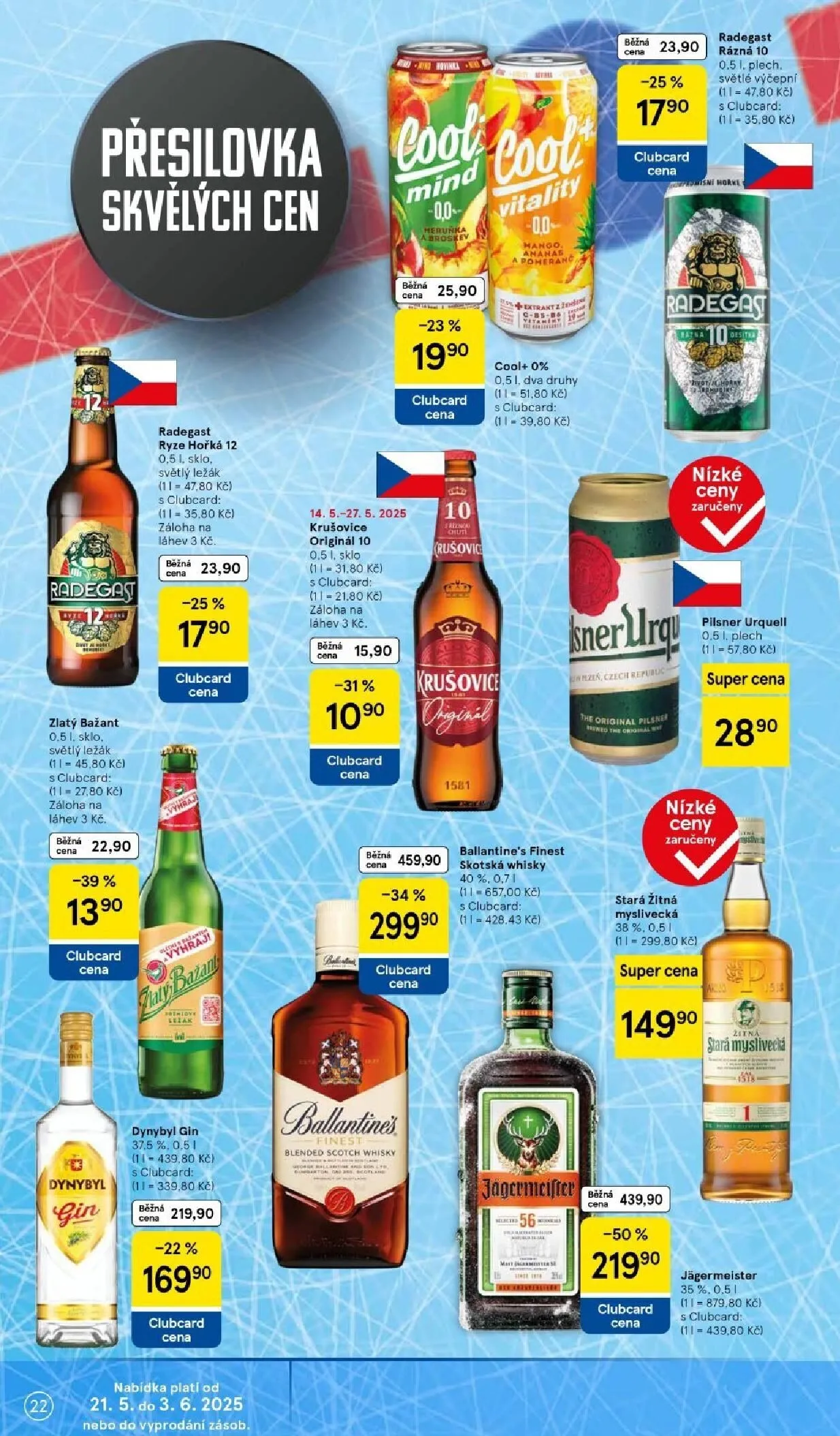 Nezapomeňte na Pilsner Urquell (0,5 l plech) za 28,90 Kč a Zlatý Bažant (0,5 l sklo) za 27,80 Kč. Pro fanoušky whisky je v nabídce Ballantine's Finest (0,7 l) za 299,90 Kč, s Clubcard cenou 429,43 Kč.