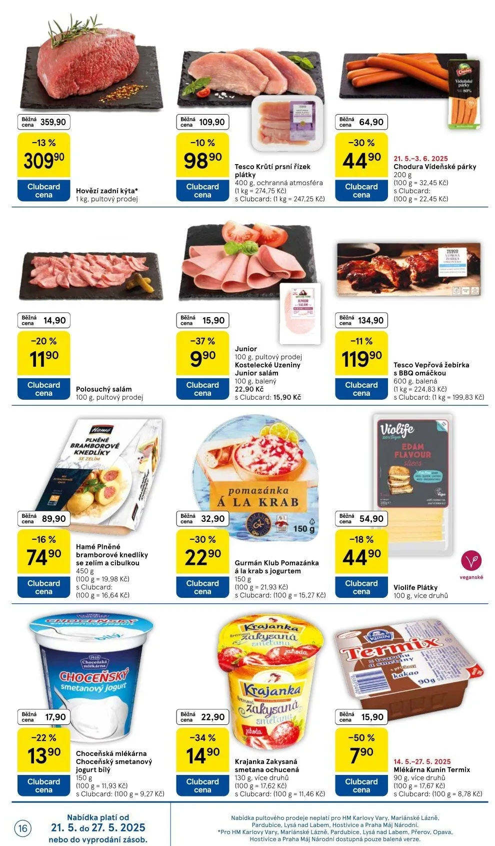 V letáku obchodu Tesco najdete širokou nabídku produktů za skvělé ceny. Mezi nimi se nachází hovězí zadní kýta za 14,90 Kč/kg s 20% slevou. Dále nabízíme polosuchý salám za 9,90 Kč/100 g a plněné bramborové knedlíky od Hamé za 74,90 Kč/450 g.