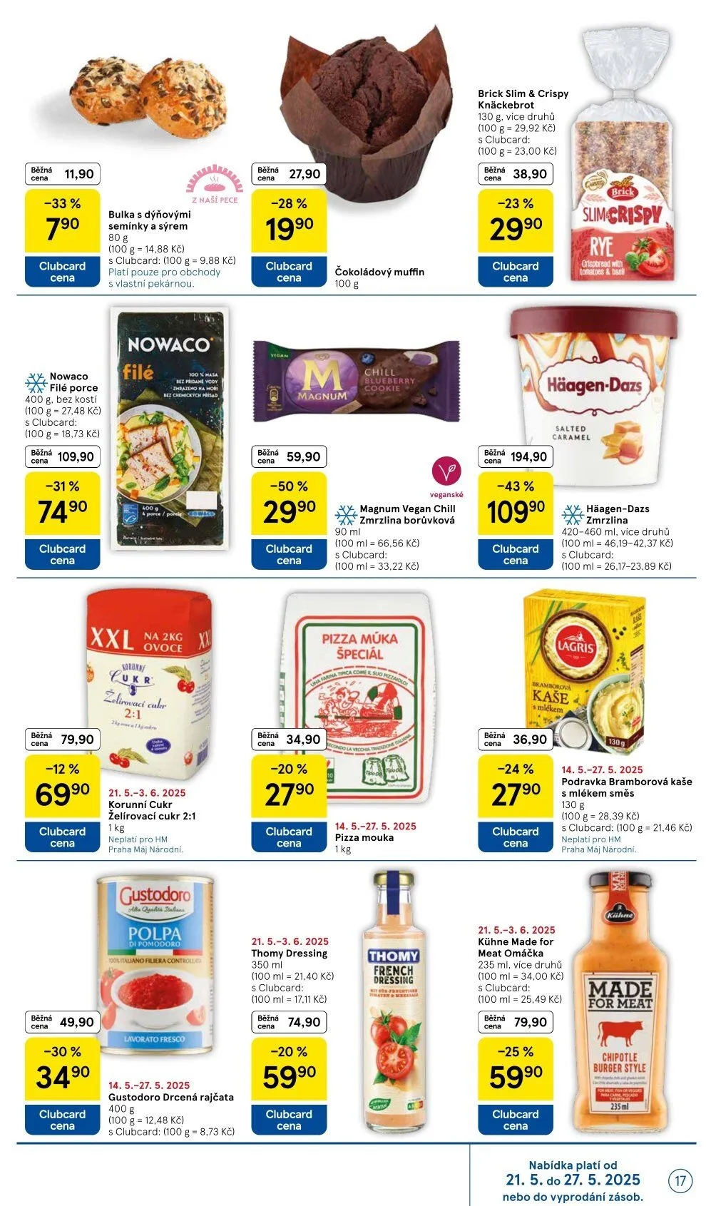 Mezi dalšími produkty najdete Gustodoro drcená rajčata za 27,90 Kč (s Clubcard 19,90 Kč/400 g) a čokoládový muffin za 29,90 Kč.