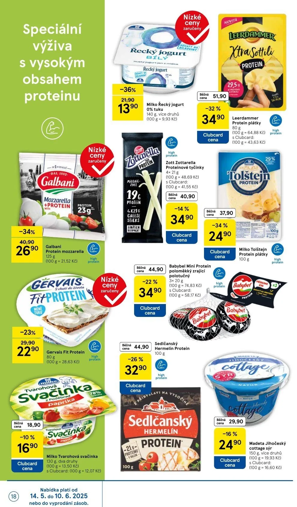 V letáku obchodu Tesco najdete širokou nabídku produktů se speciální výživou a vysokým obsahem proteinu za nízké ceny. Mezi nejzajímavější položky patří řecký jogurt Milko, který je nyní za cenu 13,90 Kč za 140 g, což představuje slevu 36%.