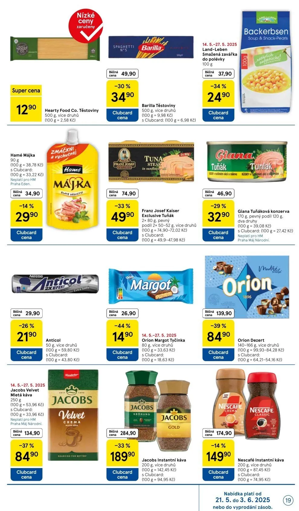 V letáku obchodu Tesco najdete skvělé nabídky na široký sortiment produktů. Například Hamé májka 90 g je nyní za super cenu 34,90 Kč, s Clubcard dokonce za 29,90 Kč. Mletá káva Jacobs Velvet 250 g je k dostání za 134,90 Kč, s Clubcard za 84,90 Kč.