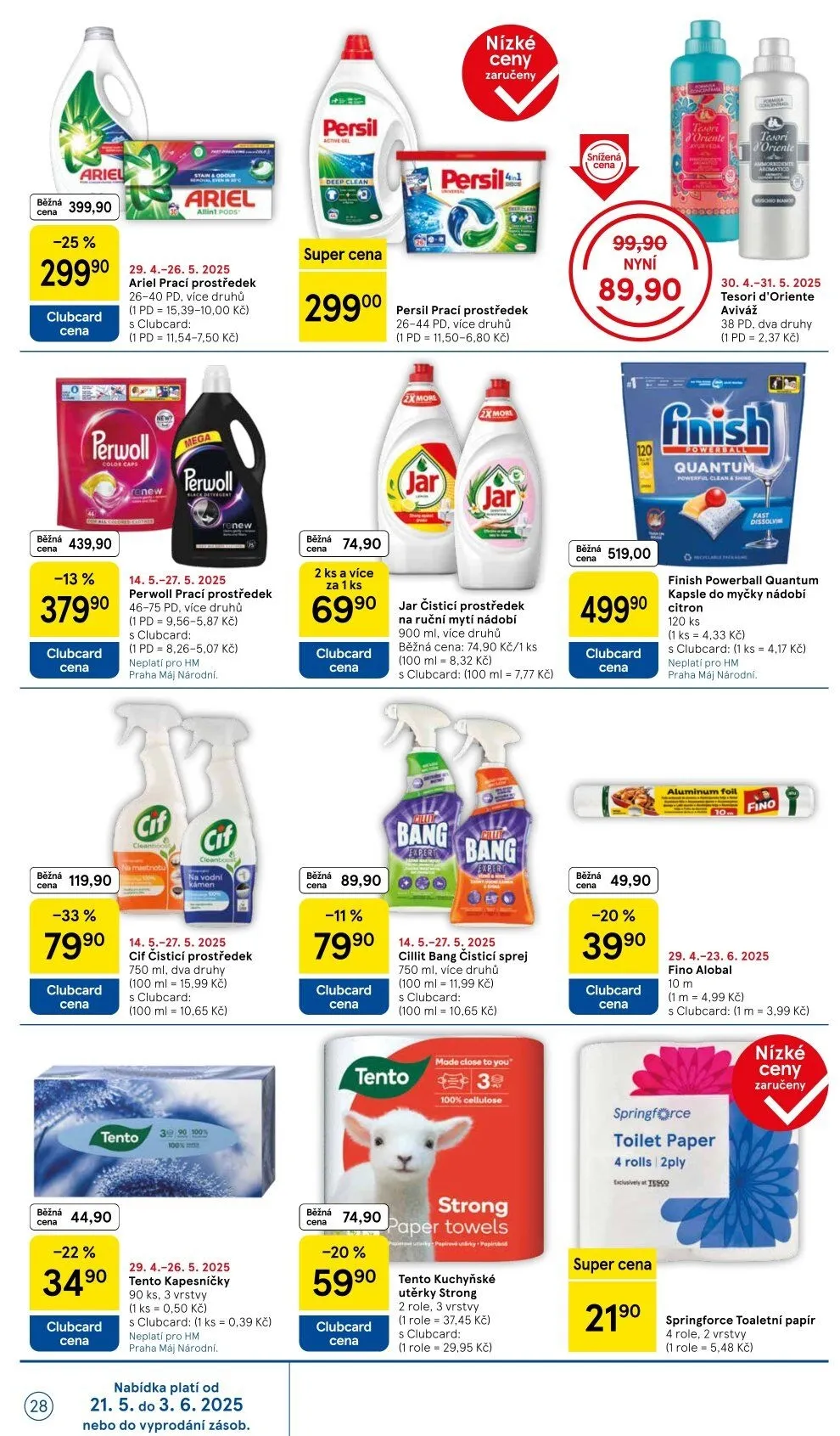 V letáku obchodu Tesco najdete širokou nabídku pracích a čisticích prostředků za skvělé ceny. Například Ariel prací prostředek je nyní k dispozici s 25% slevou, a to za cenu 299,00 Kč. S Clubcard můžete získat ještě výhodnější cenu 299,00 Kč za 2 ks a více.