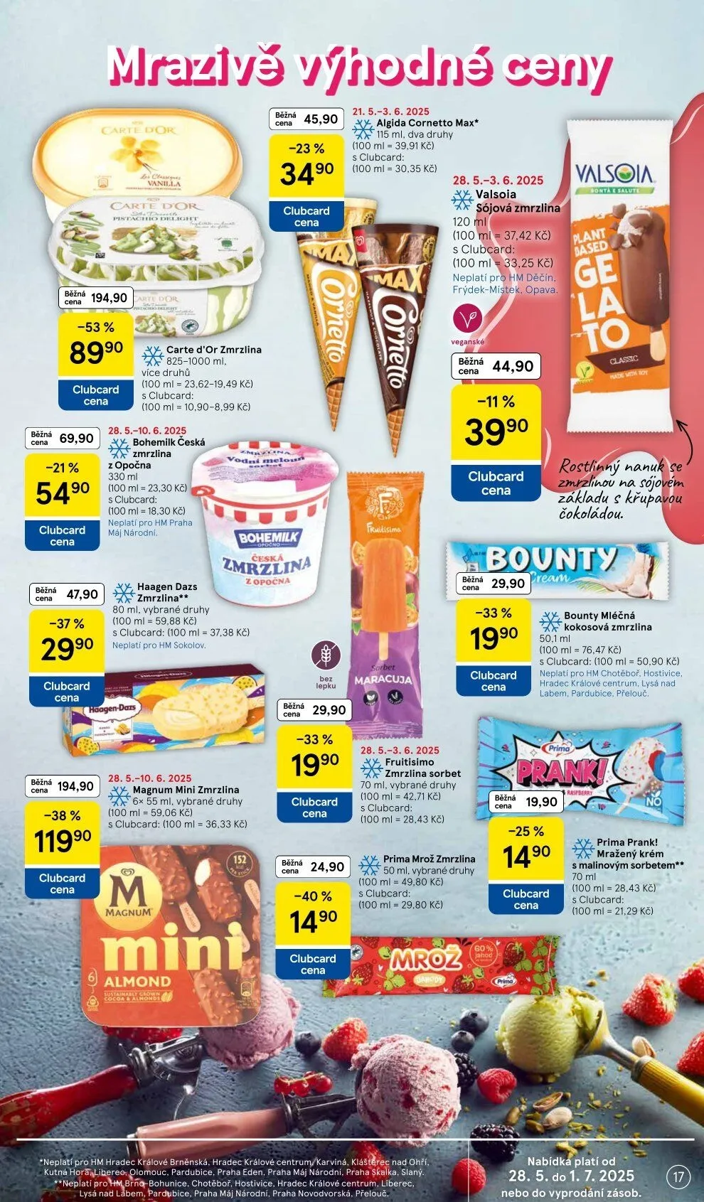 V letáku obchodu Tesco najdete širokou nabídku zmrzlin a mražených dezertů za skvělé ceny. Například Valsoia zmrzlina je nyní za 44,90 Kč, což představuje slevu 11 %. Pro milovníky klasiky je tu Carte d'Or zmrzlina v různých druzích za 194,90 Kč, se slevou 53 %.