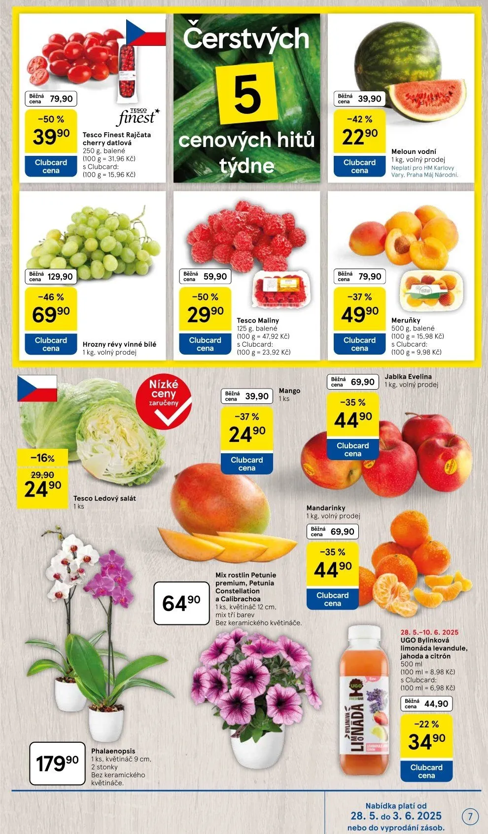 V letáku obchodu Tesco najdete skvělé nabídky na čerstvé potraviny a rostliny. Například rajčata cherry datlová za 79,90 Kč (s clubcard 39,90 Kč) a hrozny bílé révy za 129,90 Kč (s clubcard 69,90 Kč). Nezapomeňte na ledový salát za 24,90 Kč a maliny za 59,90 Kč (s clubcard 29,90 Kč).