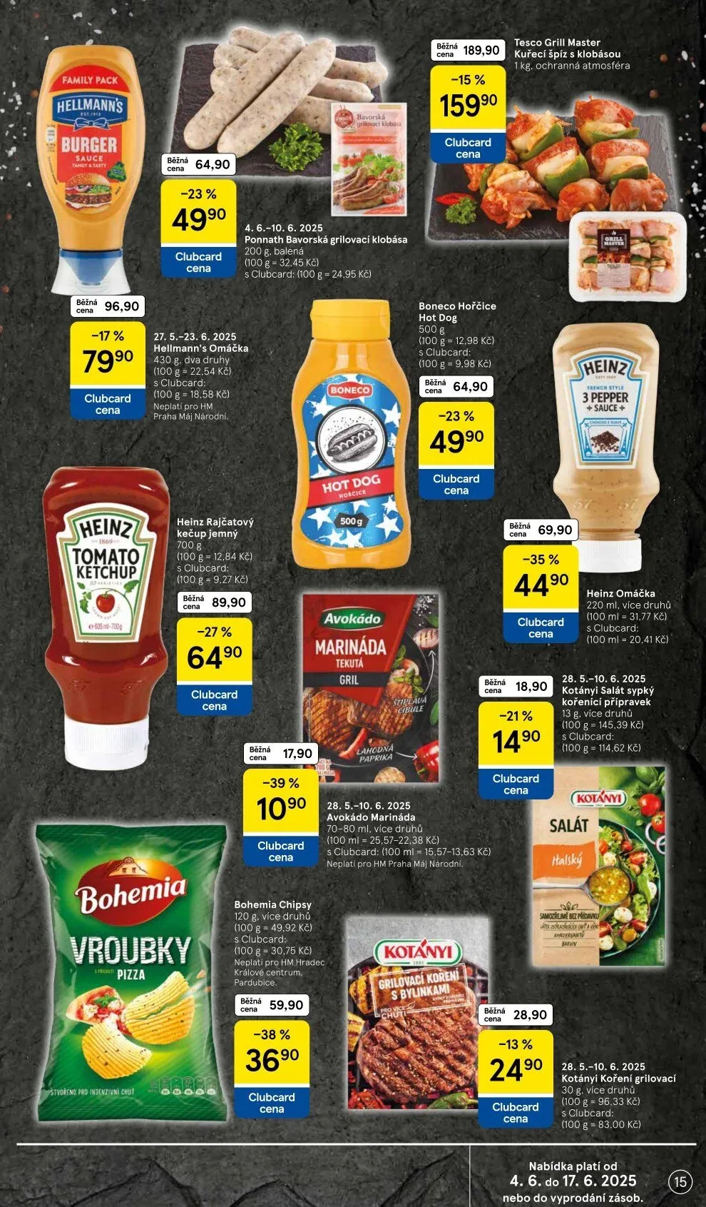 V letáku obchodu Tesco najdete širokou nabídku produktů za skvělé ceny. Například balení grilovacích klobás Ponnath o hmotnosti 200 g je nyní za 79,90 Kč, což je sleva 17 %. Dále si můžete pořídit Hellmann's omáčku 430 g, která je k dostání za 64,90 Kč s 23% slevou.