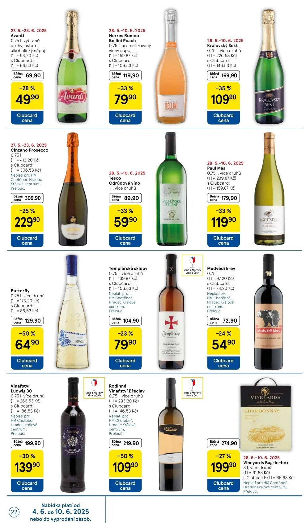 V nabídce najdete také bag-in-box víno 3 l za 22 Kč. Akce platí od 27. 5. do 10. 6. 2025 nebo do vyprodání zásob. Nezapomeňte využít Clubcard pro ještě výhodnější ceny!