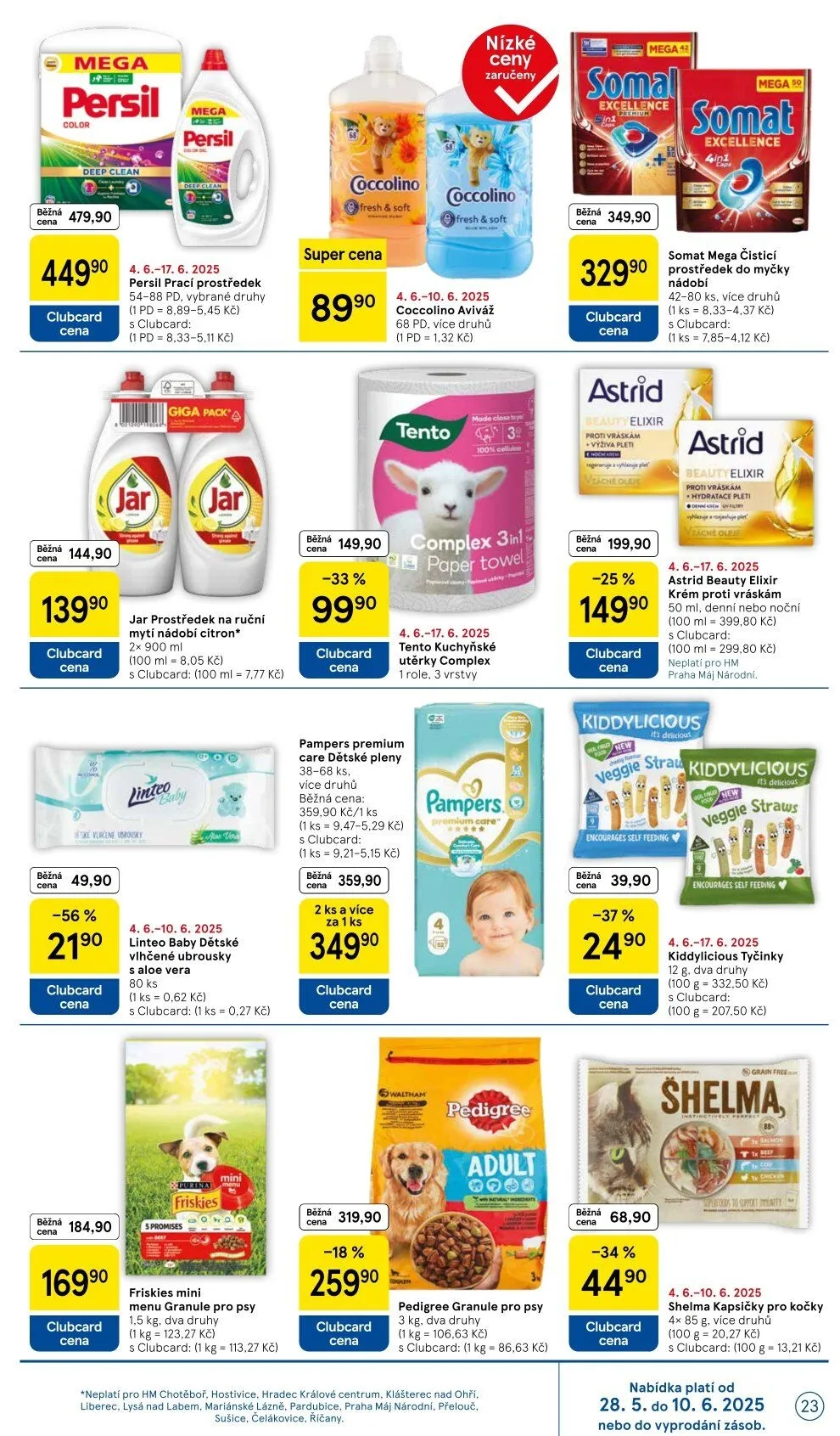 V letáku obchodu Tesco najdete širokou nabídku produktů za skvělé ceny. Mezi nimi je například jar prostředek na ruční mytí nádobí citron za 144,90 Kč, nebo aviváž Coccolino za 89,90 Kč. Nezapomeňte také na prací prostředek Persil, který je nyní za akční cenu 479,90 Kč. Pro rodiče máme dětské pleny Pampers Premium Care za 359,90 Kč a vlhčené ubrousky Linteo Baby za 184,90 Kč. Pro vaše mazlíčky nabízíme granule Friskies a Pedigree za výhodné ceny. Akce platí od 4. do 17. června 2025, tak neváhejte a využijte nízké ceny s Clubcard!