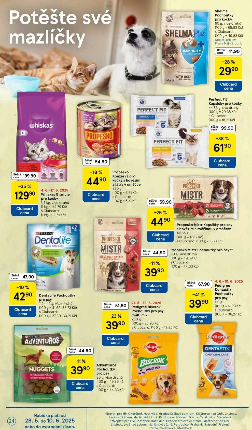 Vyzkoušejte Whiskas granule pro kočky, které jsou nyní za skvělou cenu 54,90 Kč s Clubcard. Dále máme Perfect Fit kapsičky pro kočky, 4x 85 g, za 99,90 Kč, nebo Propesko konzervy s hovězím a játry v omáčce za 51,90 Kč.