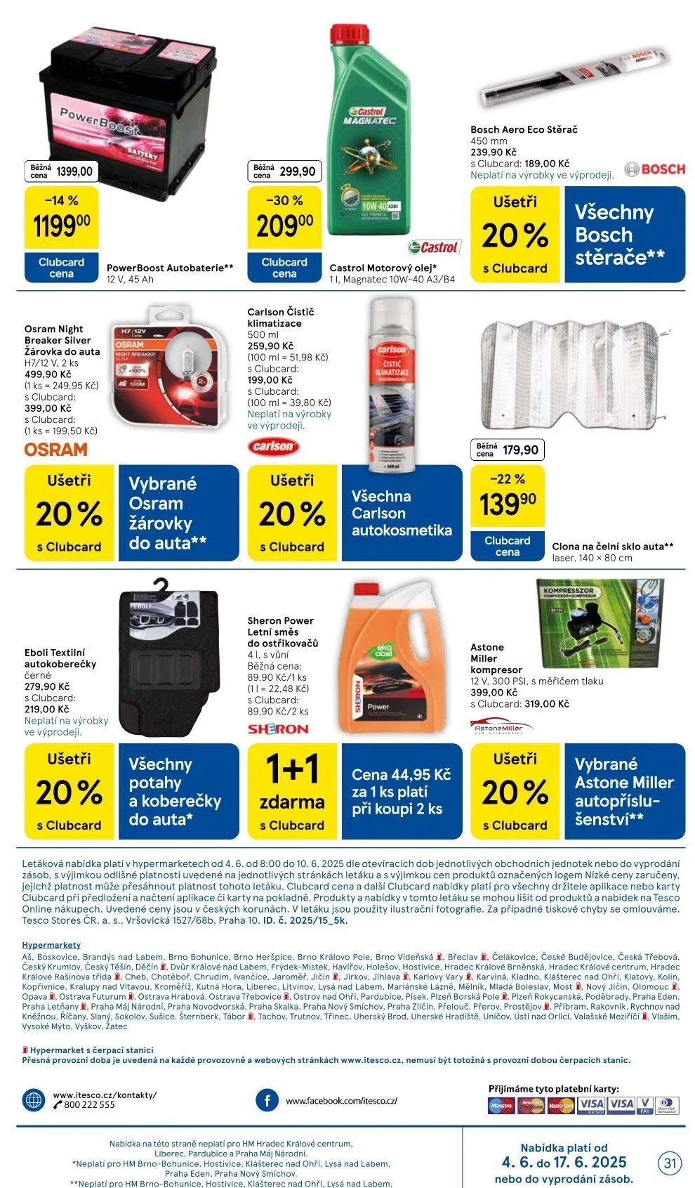 V letáku obchodu Tesco najdete širokou nabídku produktů za skvělé ceny. Například Bosch Aero Eco stěrač o délce 450 mm je nyní za 239,90 Kč, s Clubcard dokonce za 189,00 Kč. Dále nabízíme Castrol motorový olej Magnatec 1 l za 179,90 Kč, a s Clubcard ušetříte ještě více.