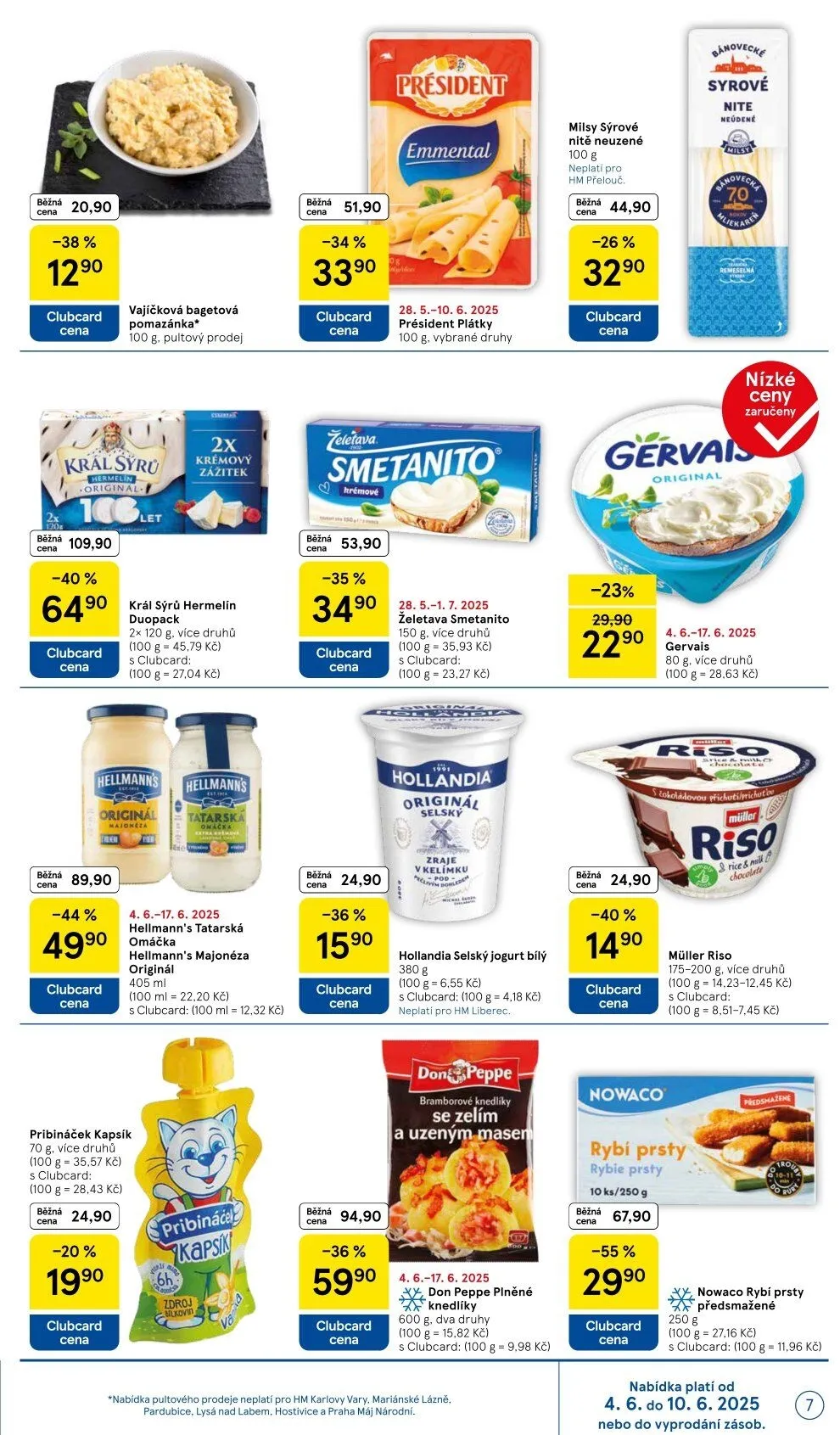 V letáku obchodu Tesco najdete širokou nabídku produktů za skvělé ceny. Například pomazánka prezident vajíčková je nyní za 51,90 Kč (100 g) s 34% slevou. Král sýrů hermelín v duopacku (2x 120 g) je k dostání za 64,90 Kč, což představuje 23% slevu.