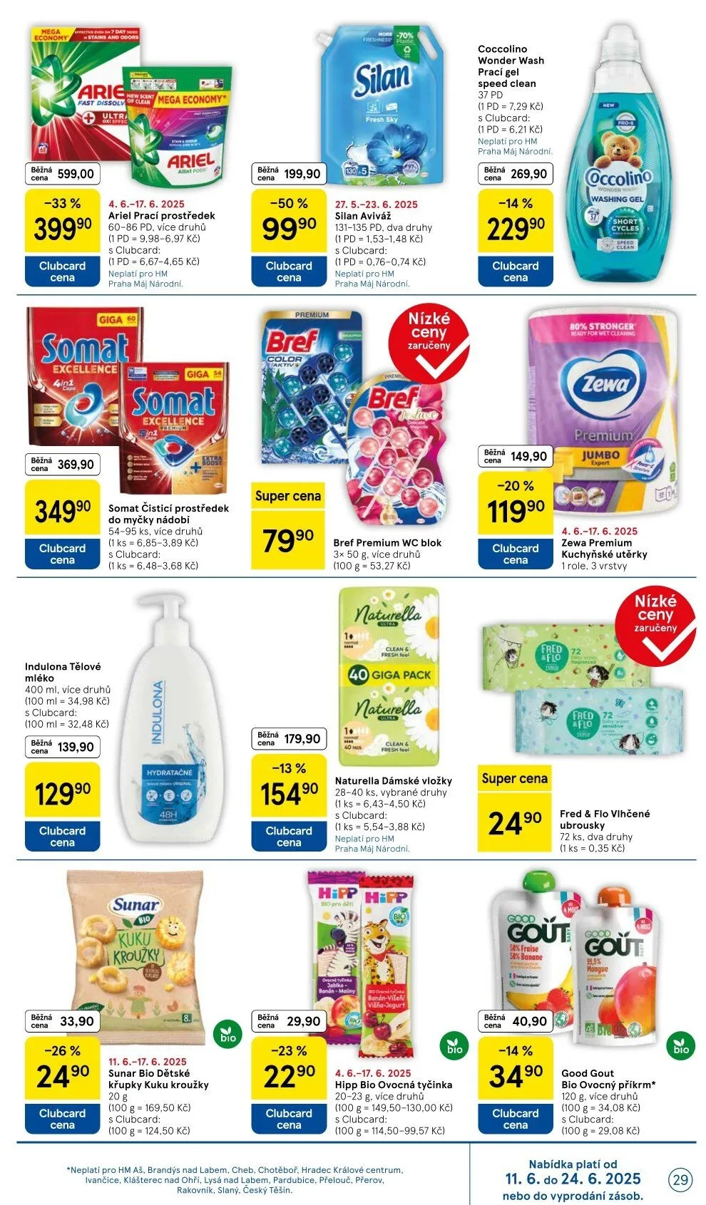 V letáku obchodu Tesco najdete širokou nabídku produktů za skvělé ceny. Například prací prostředek Ariel je nyní k dostání za 399,90 Kč, což je sleva 33 %. Silan aviváž je v akci za 179,90 Kč, a to při nákupu s Clubcard.