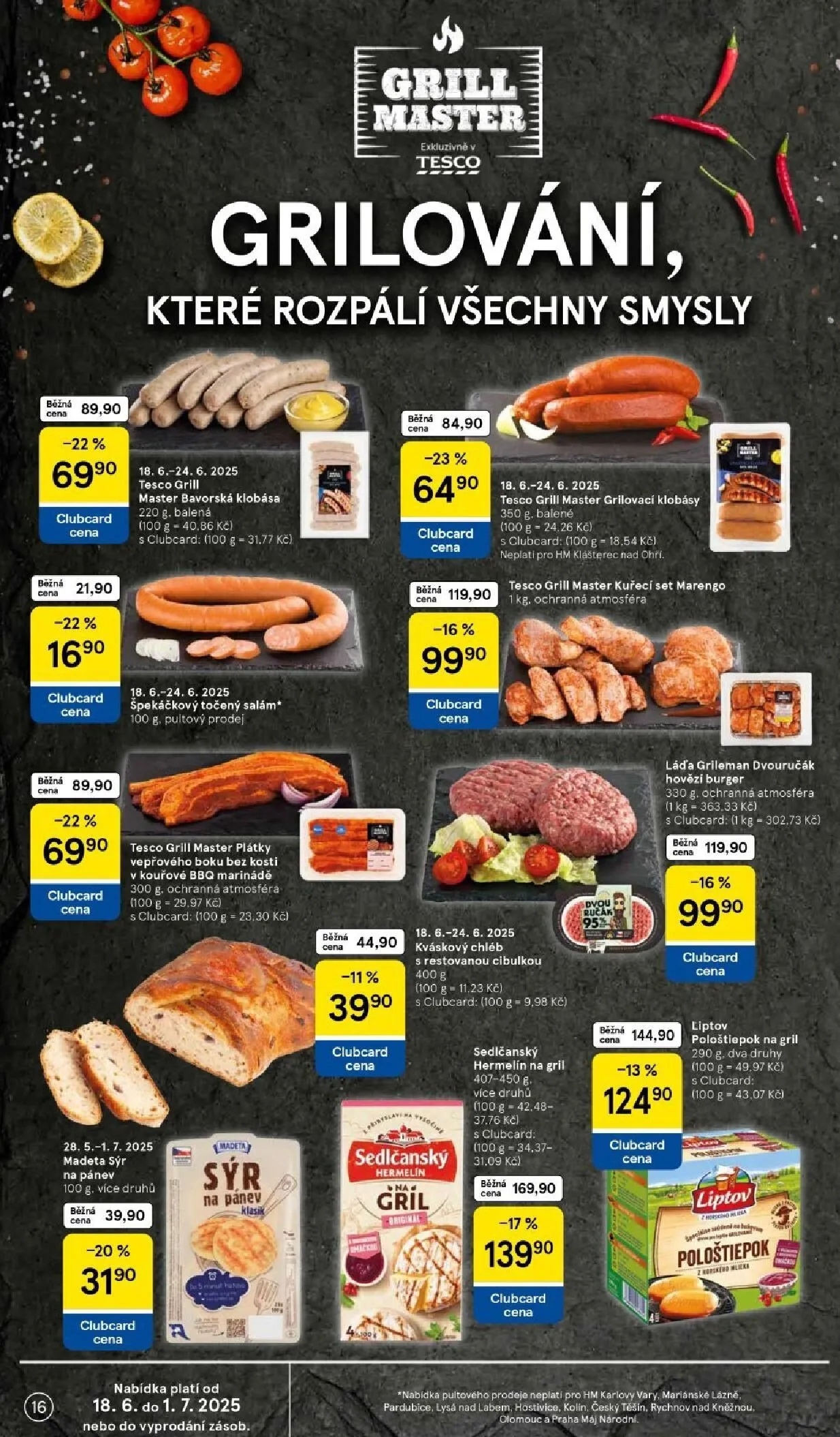 V letáku obchodu Tesco najdete skvělou nabídku produktů pro grilování, které potěší všechny milovníky dobrého jídla. Mezi hlavními lákadly je Tesco Grill Master bavorské klobásy (220 g) za cenu 89,90 Kč, nyní se slevou 22 %. Dále si můžete vychutnat špejle točený (100 g) za 21,90 Kč a vepřové plátky v kouřové marinádě (300 g) za 84,90 Kč.