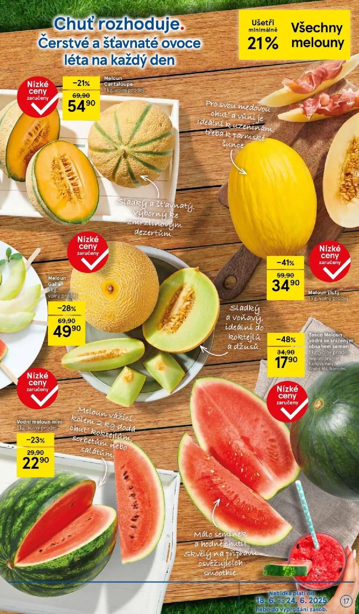 V letáku obchodu Tesco najdete širokou nabídku čerstvého a šťavnatého ovoce za nízké ceny. Ušetřete s našimi melouny, které jsou ideální pro osvěžení v horkých dnech. Nabízíme cantaloup za 54,90 Kč, vodní meloun mini za 22,90 Kč a sladký žlutý meloun za 34,90 Kč. Všechny produkty mají zaručené nízké ceny na každý den. Nezapomeňte, že akce platí do vyprodání zásob. Přijďte si vybrat to nejlepší ovoce pro vaše dezerty a osvěžení!