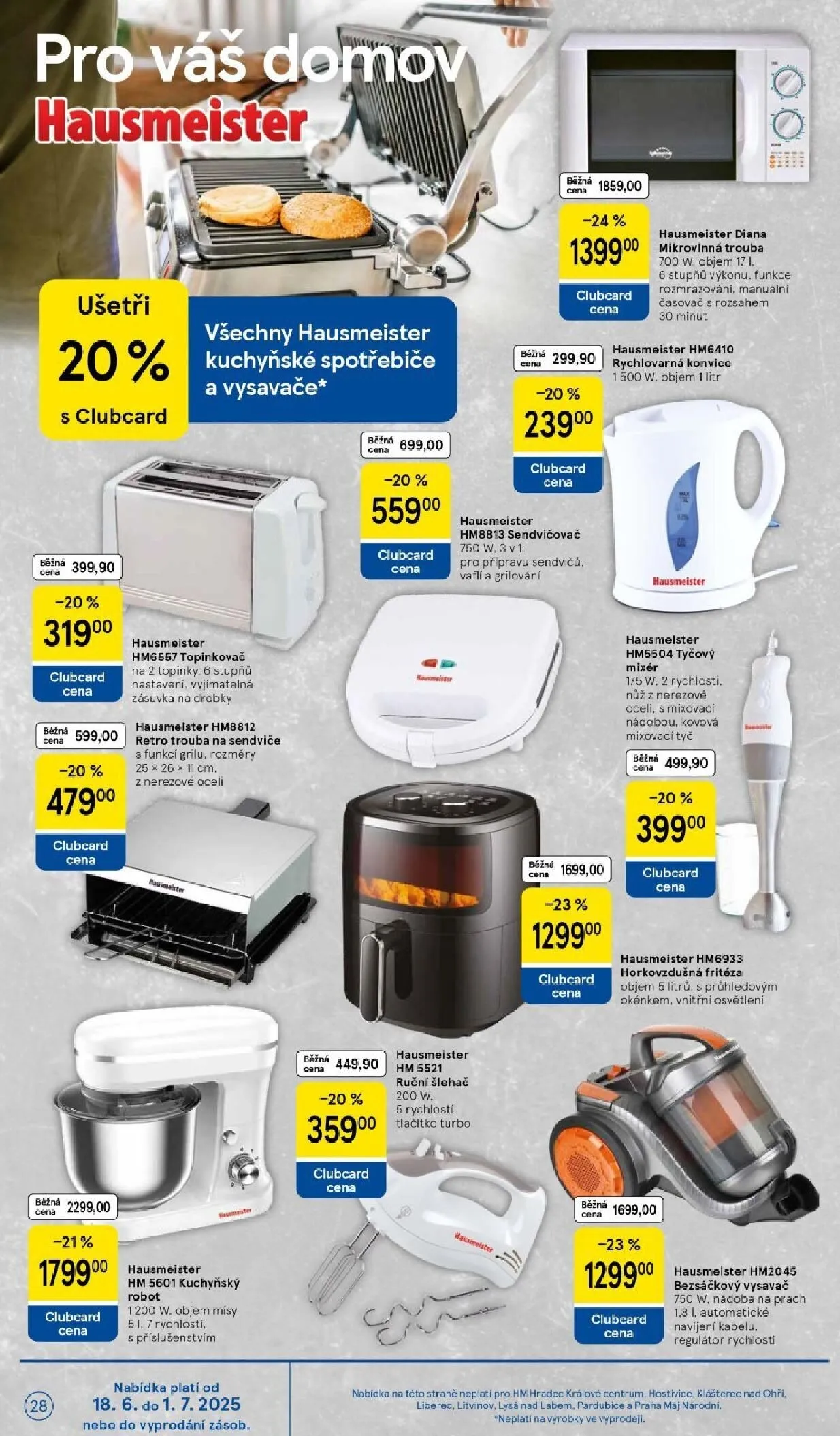 V letáku obchodu Tesco najdete širokou nabídku kuchyňských spotřebičů značky Hausmeister se slevami až 24 %. Mezi produkty se nachází trouba Hausmeister Diana s objemem 171 litrů a funkcí rozmrazování za cenu 1 399 Kč s Clubcard. Dále nabízíme rychlovarnou konvici Hausmeister HM6410 za 239 Kč, sendvičovač HM8813 za 319 Kč a topinkovač HM053 na 2 topinky za 479 Kč. Nezapomeňte také na kuchyňský robot HM5601 s příslušenstvím za 1 299 Kč a bezsáčkový vysavač HM2045 za 1 299 Kč. Akce platí od 18. 6. do 1. 7. 2025 nebo do vyprodání zásob.