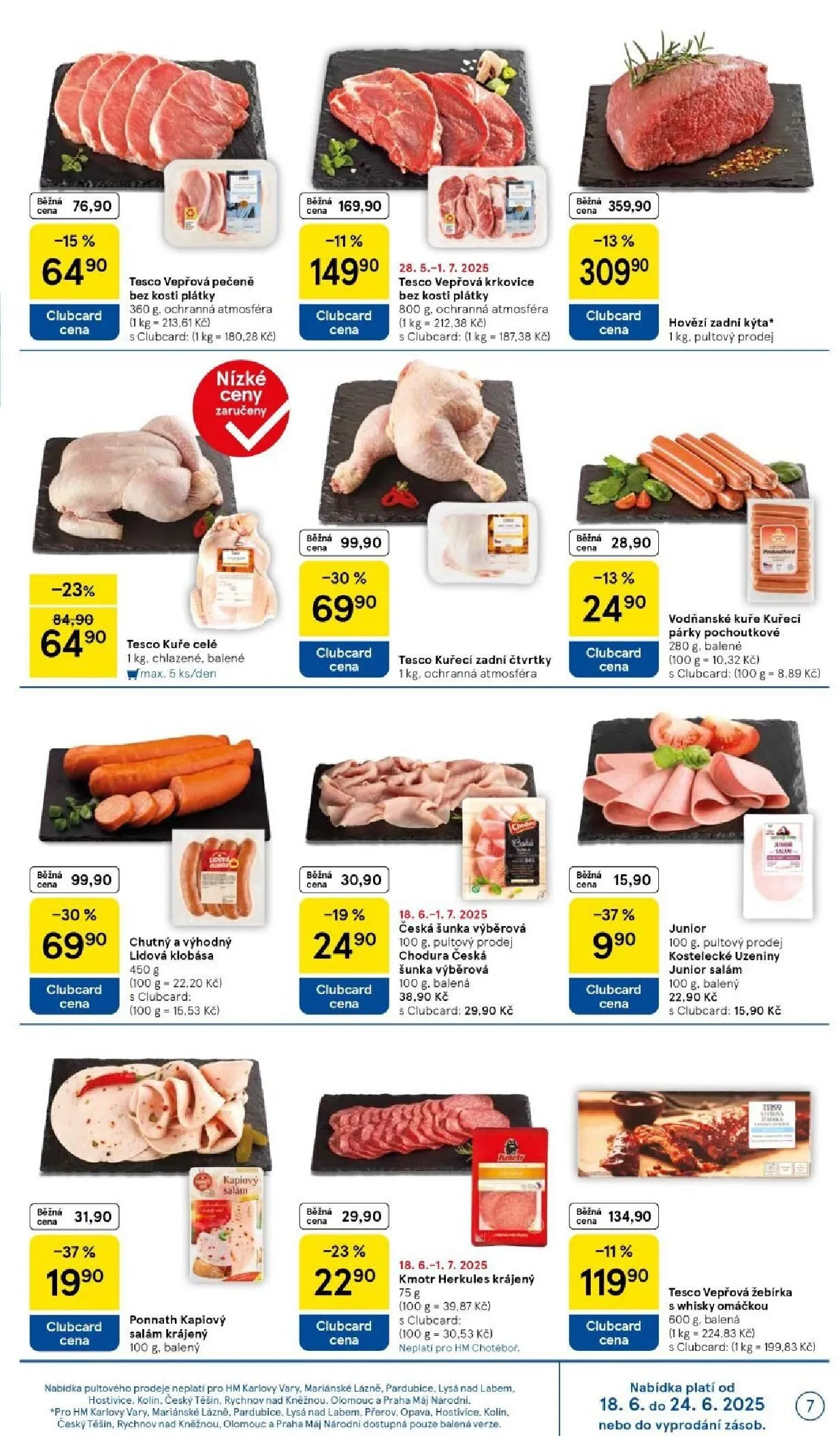 Dalšími lákadly jsou lidová klobása (450 g) za 99,90 Kč a česká výběrová šunka (100 g) za 29,90 Kč. Nezapomeňte využít Clubcard, která vám přinese ještě nižší ceny. Akce platí od 18. 6. do 1. 7. 2025 nebo do vyprodání zásob. Navštivte Tesco a objevte skvělé nabídky!