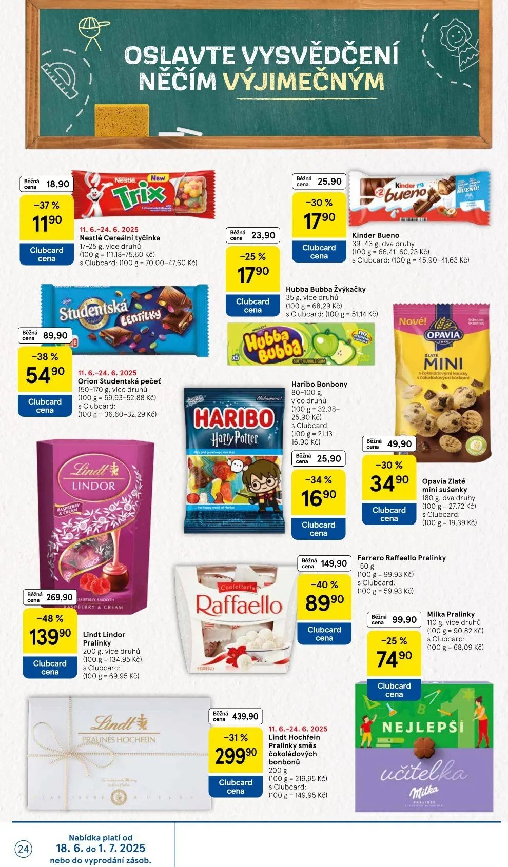 Oslavte vysvědčení něčím výjimečným! V našem letáku Tesco najdete skvělé nabídky na sladkosti a pochutiny. Například Nestlé cereální tyčinky za 25,90 Kč, Kinder Bueno za 17,90 Kč a Hubba Bubba žvýkačky za 16,90 Kč. Nezapomeňte na Haribo bonbony a Orion Studentskou pečeť, které jsou také v akci.
