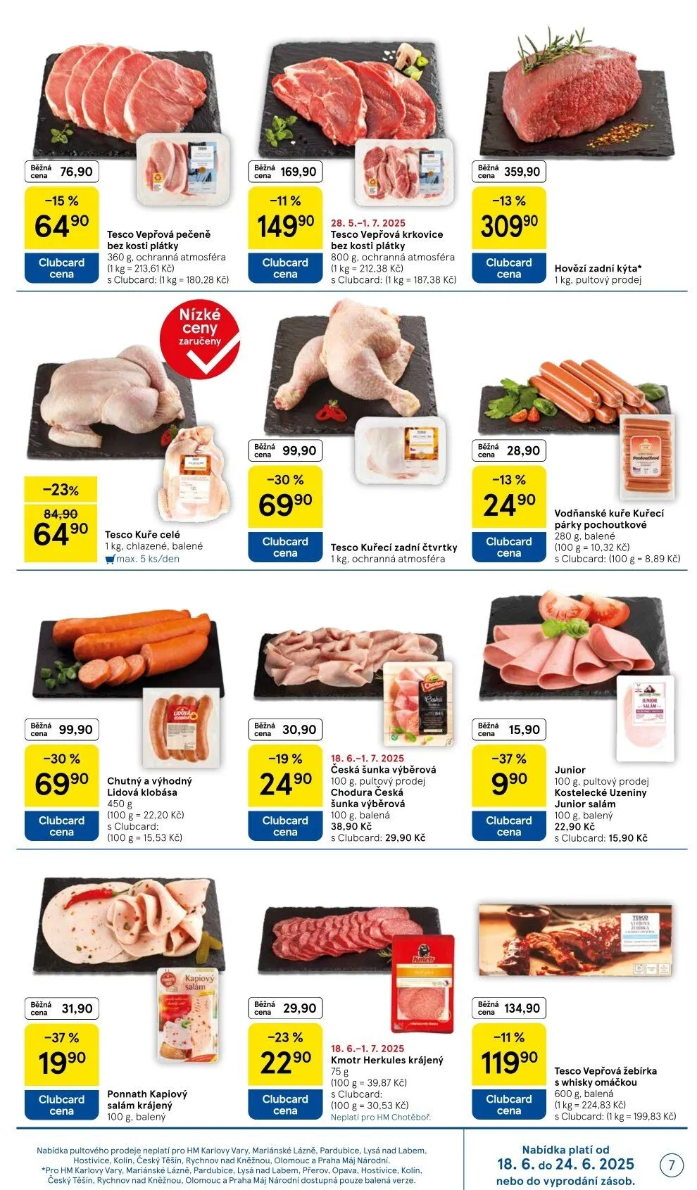 Dalšími lákavými nabídkami jsou Ponnath kapiový salám (100 g) za 149 Kč, nebo Tesco vepřová krkovice bez kosti (1 kg) za 249 Kč s clubcard. Nezapomeňte také na českou šunku výběrovou, kterou pořídíte za 29,90 Kč za 100 g s clubcard.