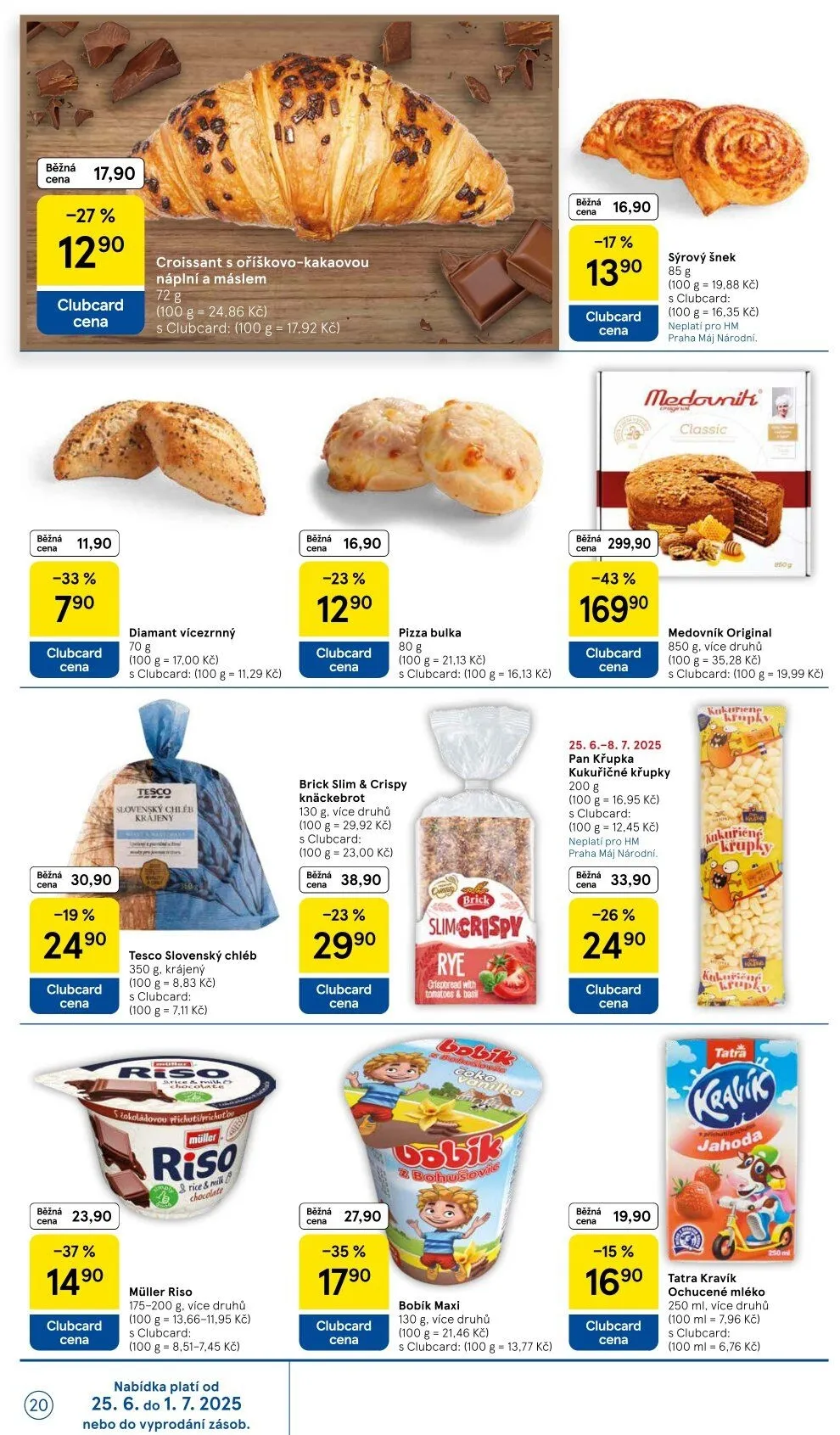 V letáku obchodu Tesco najdete širokou nabídku produktů za skvělé ceny. Například croissant s oříškovo-kakaovou náplní a máslem je nyní za 17,90 Kč, což představuje slevu 27 %. Sýrový šnek o hmotnosti 85 g můžete pořídit za 29,90 Kč, což je sleva 43 %.