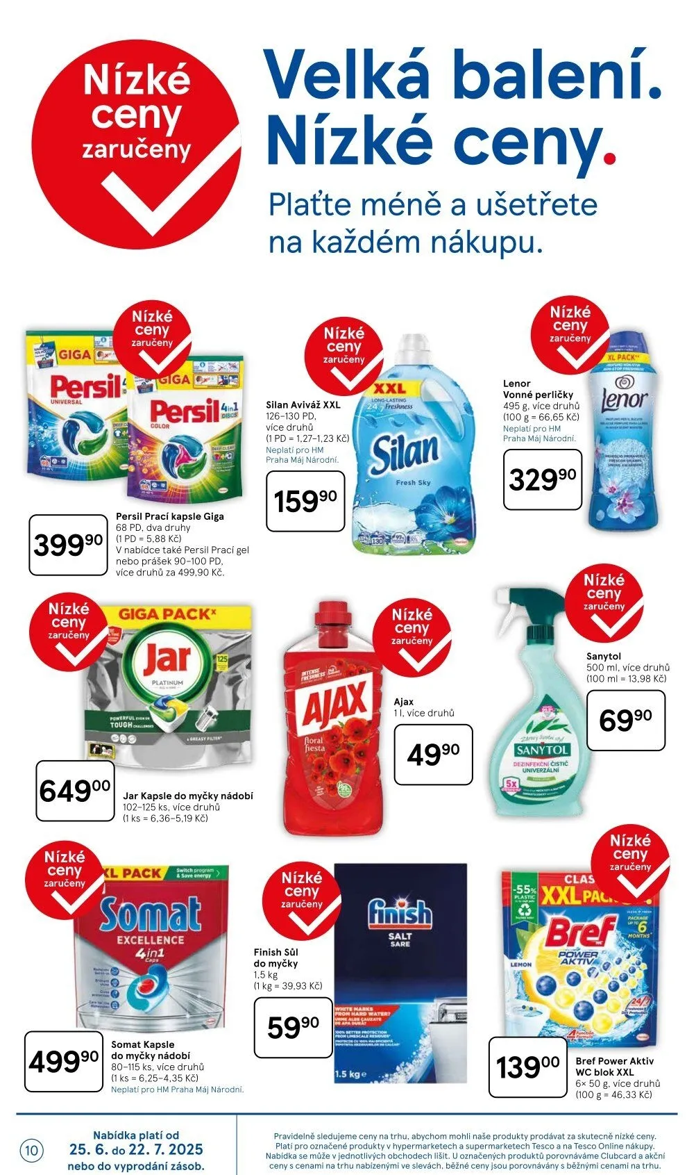 V letáku obchodu Tesco najdete širokou nabídku produktů za nízké ceny, které jsou zaručeny. Mezi nimi se objevují velká balení aviváže Silan, prací kapsle Persil a mycí kapsle Jar. Dále nabízíme Finish sůl do myčky, vonné perličky Lenor a čisticí prostředky Ajax a Sanytol. Nezapomeňte také na Bref Power aktiv pro údržbu toalety. Naše nabídka platí od 25. 6. do 22. 7. 2025 nebo do vyprodání zásob. Sledujeme ceny na trhu, abychom vám mohli nabídnout skutečně výhodné nákupy.