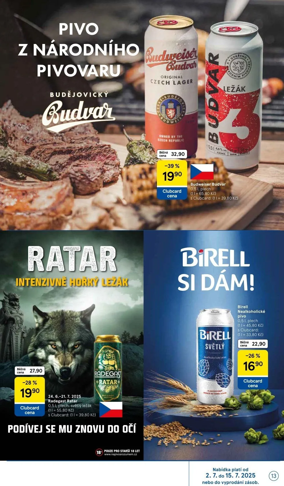 V letáku obchodu Tesco najdete skvélé nabídky na pivo z národního pivovaru. Například pivo Budweiser Budvar v plechovce je nyní za cenu 32,90 Kč, což představuje slevu 39 % z původní ceny 19,90 Kč. Dále je v nabídce nealkoholické pivo Birell světlé za 27,90 Kč, se slevou 28 % z původní ceny 19,90 Kč. Pro členy Clubcard je cena ještě výhodnější, například Birell za 22,90 Kč. Nabídka platí od 2. 7. do 15. 7. 2025 nebo do vyprodání zásob. Nezapomeňte se podívat na další skvělé akce!
