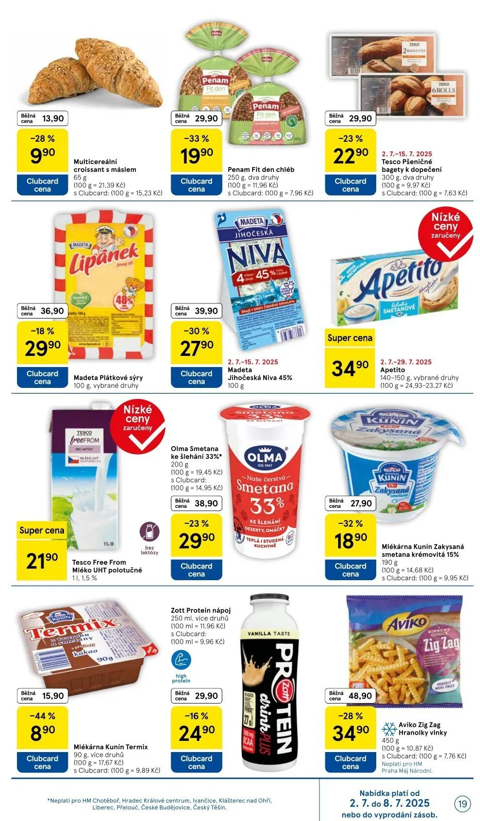 Mezi mléčnými výrobky se můžete těšit na Jihočeskou nivu 45 % za 36,90 Kč a Olma smetanu ke šlehání 33 % za 38,90 Kč. Pro milovníky proteinových nápojů máme Zott protein nápoj za 24,90 Kč, s cenou pro členy Clubcard 19,90 Kč.