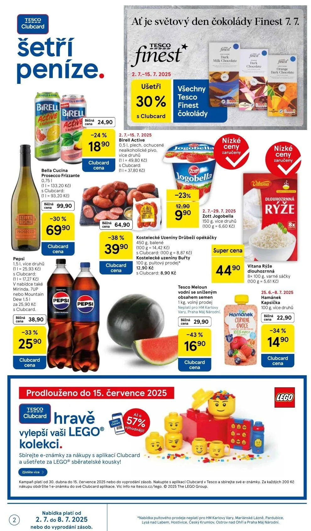 V letáku obchodu Tesco najdete skvělé nabídky od 2. do 15. července 2025. Ušetřete s Clubcard na široké škále produktů! Například Birell Active ochucené nealkoholické pivo za 24,90 Kč s Clubcard, nebo Tesco Finest čokolády se slevou 23 %.