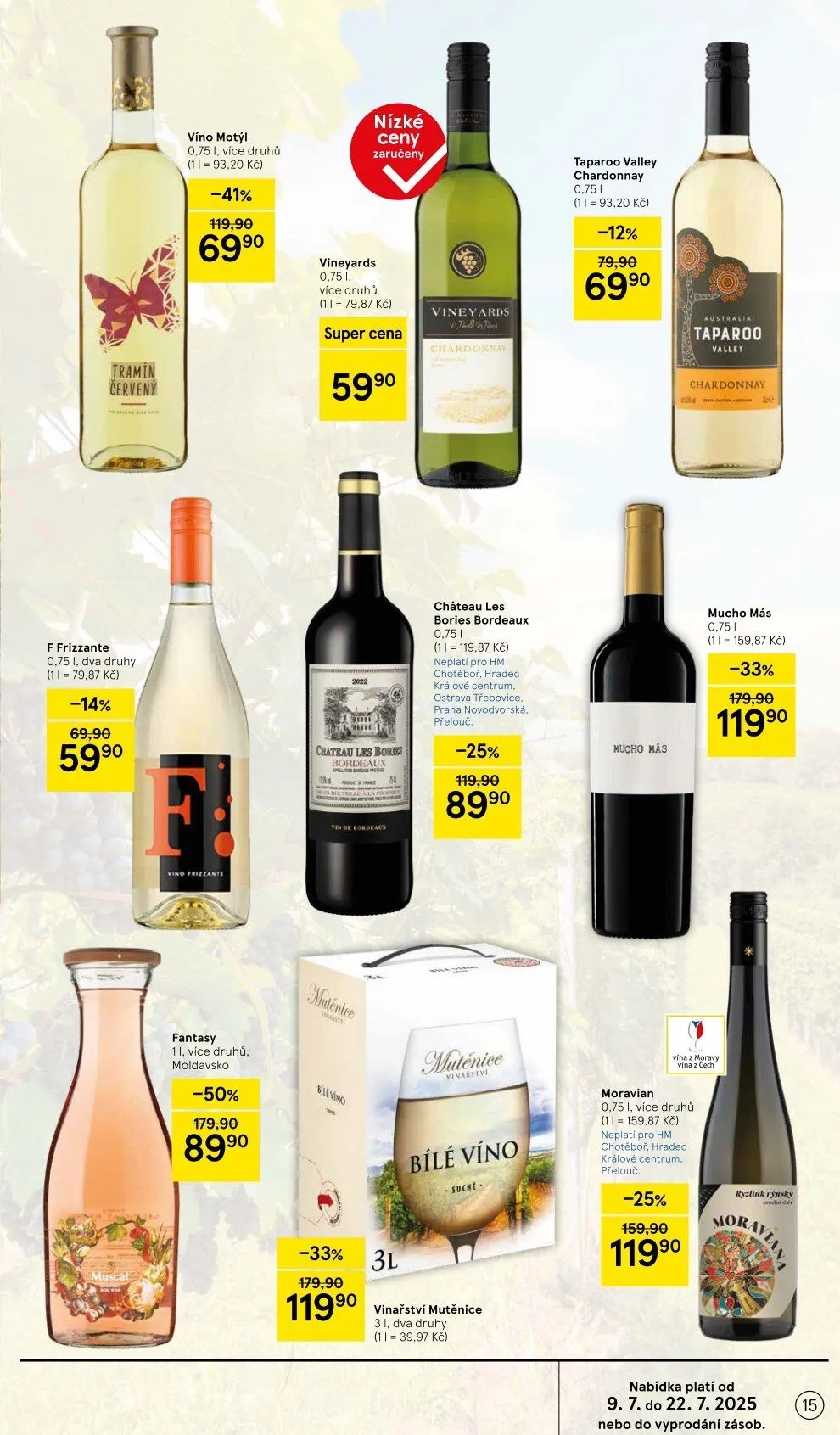 V letáku obchodu Tesco najdete širokou nabídku vín za skvělé ceny. Mezi nabízenými produkty se objevují červená vína Frizzante a Motýl, obě v objemu 0,75 l, s výraznými slevami. Dále si můžete vybrat z bílého vína Taparoo Chardonnay a vína z Moravy, které jsou také k dispozici v různých variantách. Všechny produkty jsou za atraktivní ceny, přičemž některé z nich mají slevy až 50 %. Nabídka platí od 9. 7. do 22. 7. 2025 nebo do vyprodání zásob. Nezapomeňte, že některé akce se nevztahují na vybrané prodejny.