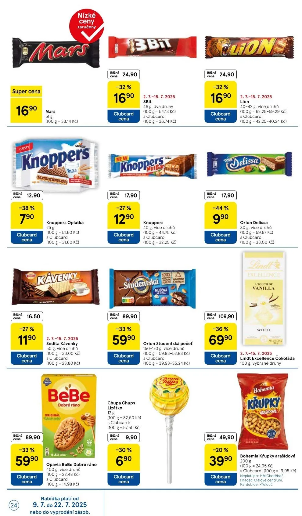 V letáku obchodu Tesco najdete širokou nabídku produktů za nízké ceny. Například oplatky Knoppers jsou nyní k dostání za super cenu 12,90 Kč (s clubcard 9,90 Kč). Lízátka Chupa Chups můžete pořídit za 24,90 Kč (s clubcard 17,90 Kč).
