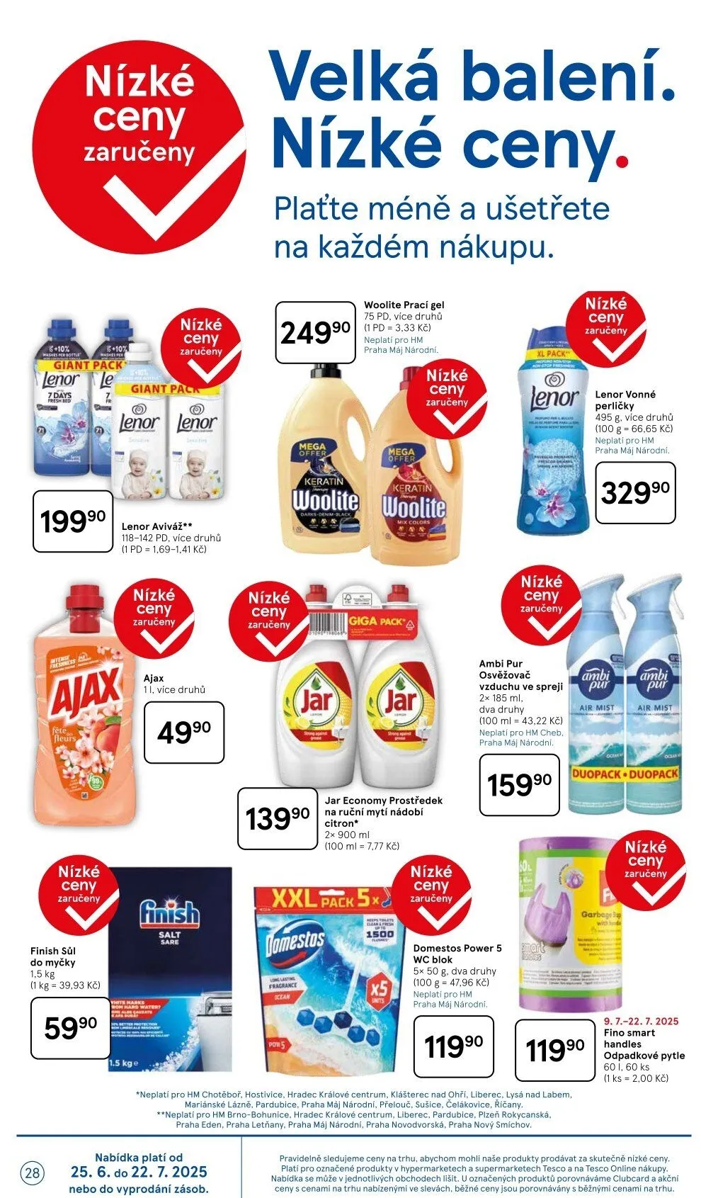 V letáku obchodu Tesco najdete širokou nabídku produktů za nízké ceny, které jsou zaručeny. Mezi nimi se nachází velká balení pracího gelu Woolite, aviváže Lenor a Finish soli do myčky. Dále nabízíme osvěžovače vzduchu Ambi Pur a prostředky na mytí nádobí Jar. Nezapomeňte také na odpadkové pytle Fino Smart a WC bloky Domestos Power 5. Všechny produkty jsou dostupné za výhodné ceny, které vám pomohou ušetřit na každém nákupu. Nabídka platí do vyprodání zásob, tak neváhejte a navštivte nás!