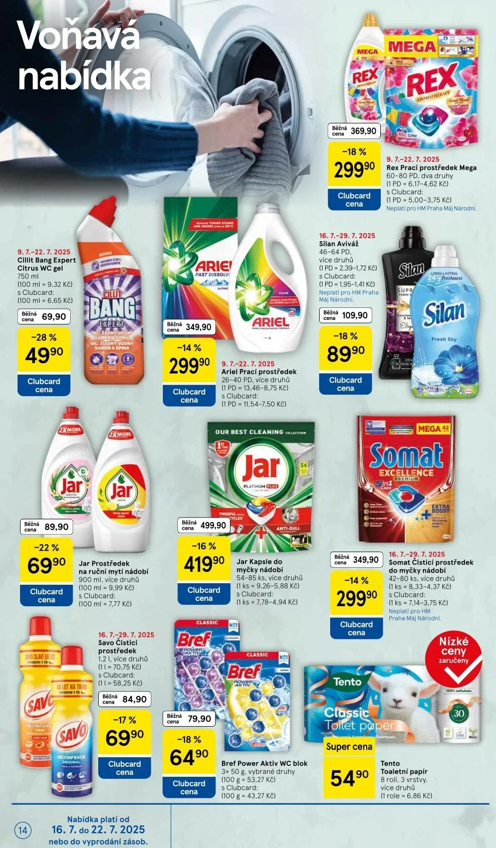 V letáku obchodu Tesco najdete širokou nabídku produktů za skvělé ceny. Například prací prostředek REX Mega za 299,90 Kč s 18% slevou, nebo Cillit Bang Expert citrus WC gel za 69,90 Kč, což představuje 28% úsporu.