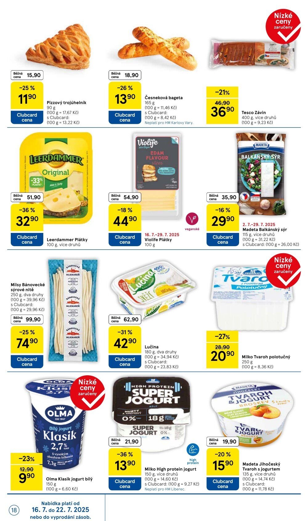 Mezi dalšími produkty se objevují veganské Violife plátky (100 g) za 35,90 Kč a Madeta balkánský sýr (115 g) za 51,90 Kč, s Clubcard za 26,00 Kč za 100 g.