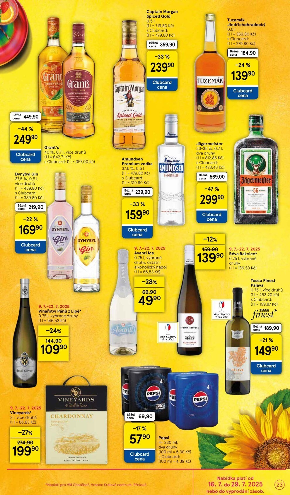 V letáku obchodu Tesco najdete širokou nabídku alkoholických nápojů a vín za skvělé ceny. Například Captain Morgan Spiced Gold je nyní za 359,90 Kč, s Clubcard dokonce za 239,90 Kč, což představuje slevu 33 %.