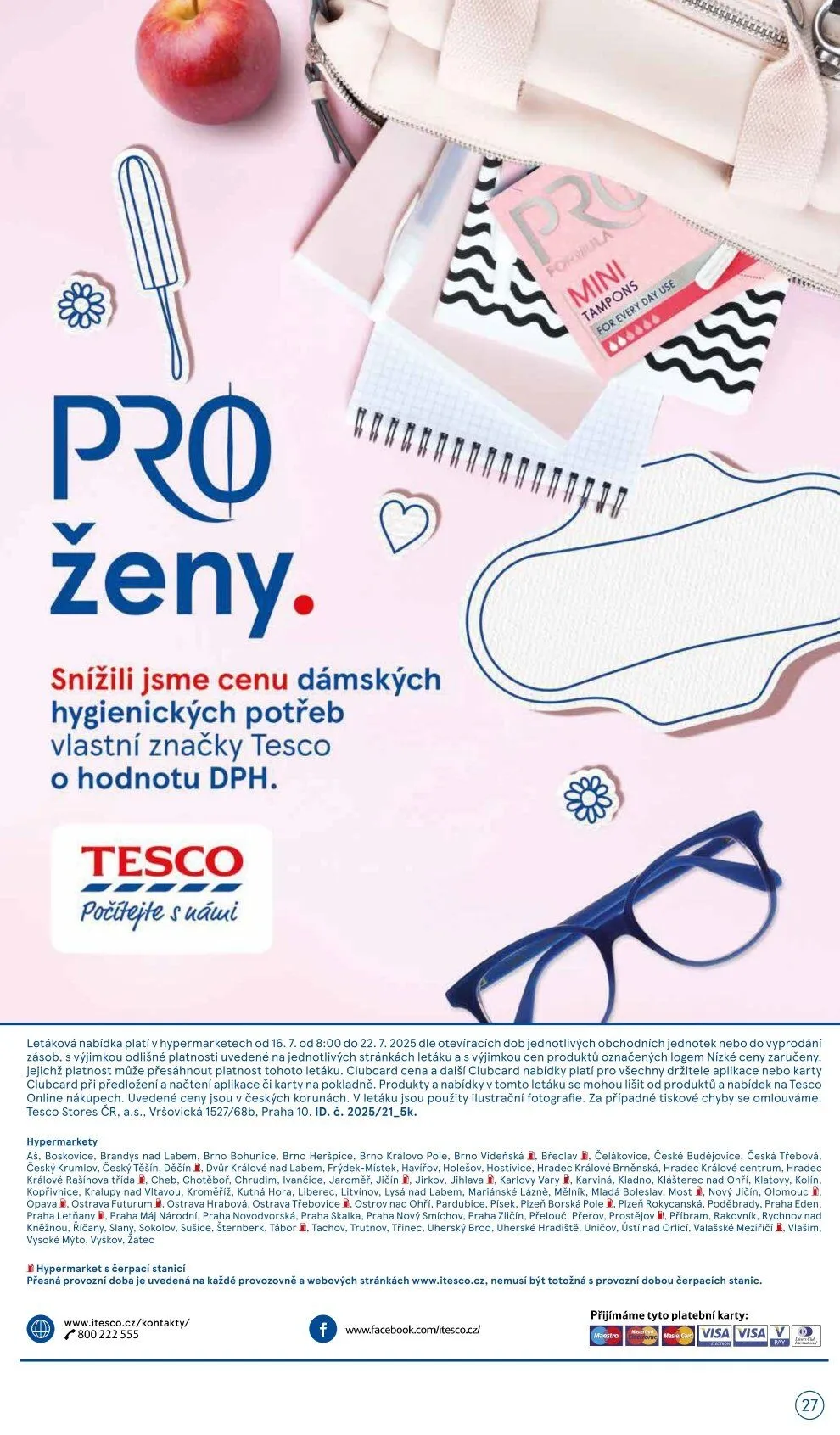V letáku obchodu Tesco jsme pro vás připravili skvělou nabídku dámských hygienických potřeb vlastní značky Tesco. Nyní jsme snížili jejich cenu o hodnotu DPH, což znamená, že můžete ušetřit ještě více. Tato akční nabídka platí v hypermarketech od 16.7. do 22.7. 2025, nebo do vyprodání zásob. Nezapomeňte, že Clubcard ceny a další nabídky platí pro všechny držitele aplikace nebo karty Clubcard. Uvedené ceny jsou v českých korunách a v letáku najdete ilustrační fotografie. Těšíme se na vaši návštěvu!