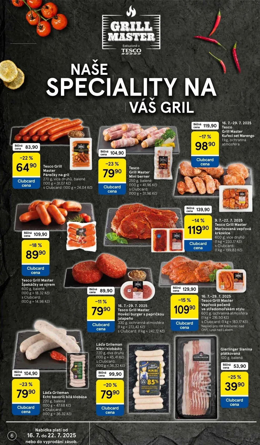 Nezapomeňte na marinovanou vepřovou krkovici za 79,90 Kč (s clubcard 69,90 Kč) a hovězí burger s papričkou jalape?o za 109,90 Kč (s clubcard 99,90 Kč).