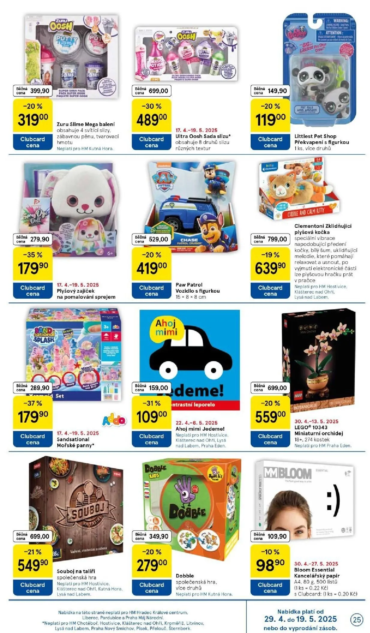 V letáku obchodu Tesco najdete širokou nabídku zajímavých produktů za skvělé ceny. Například Zuru Slime mega balení, které obsahuje 4 svítící slizy, zábavnou pěnu a tvarovací hmotu, je nyní za cenu 179,90 Kč po slevě 35 %. Dále si můžete pořídit ultra Oosh sadu slizu s 8 různými texturami za 419,00 Kč, nebo plyšového zajíčka na pomalování sprejem za 179,90 Kč.