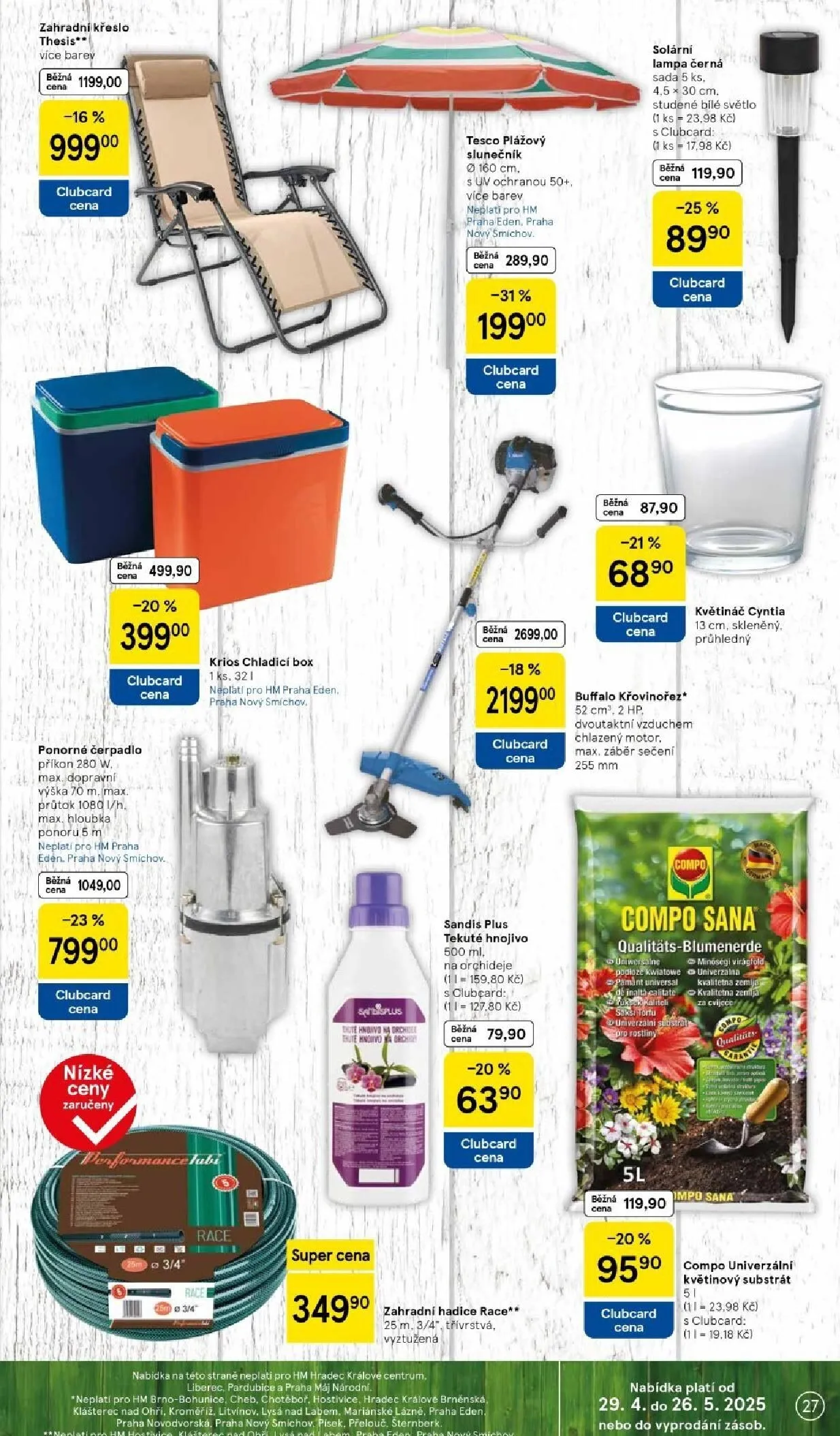 V letáku obchodu Tesco najdete širokou nabídku produktů pro vaši zahradu a domácnost. Mezi zajímavé položky patří zahradní křeslo za 999,00 Kč s Clubcard cenou 799,00 Kč, ponorné čerpadlo s výkonem 280 W za 1049,00 Kč, nyní za 799,00 Kč.