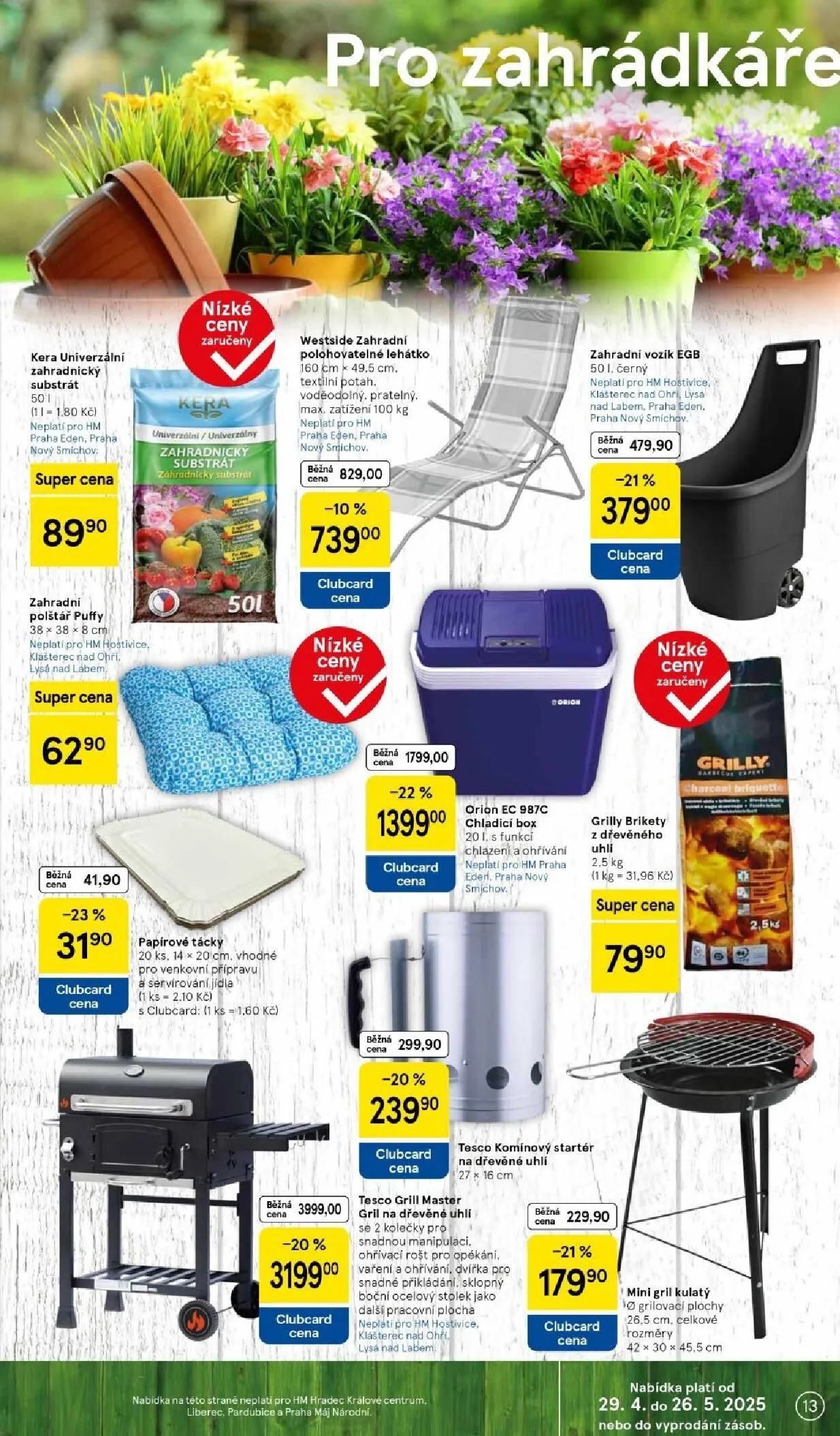 V letáku obchodu Tesco najdete širokou nabídku produktů pro zahradu a grilování. Mezi nejzajímavější položky patří zahradnický substrát za skvělou cenu 89,90 Kč a pohodlné polohovatelné lehátko za 739,00 Kč. Pro milovníky grilování máme v nabídce gril na dřevěné uhlí s kolečky za 1 799,00 Kč a komínový startér za 229,90 Kč. Nezapomeňte také na brikety z dřevěného uhlí za 79,90 Kč a praktické papírové tácky na venkovní servírování. Všechny ceny jsou s Clubcard a platí do vyprodání zásob. Navštivte nás a využijte nízké ceny!