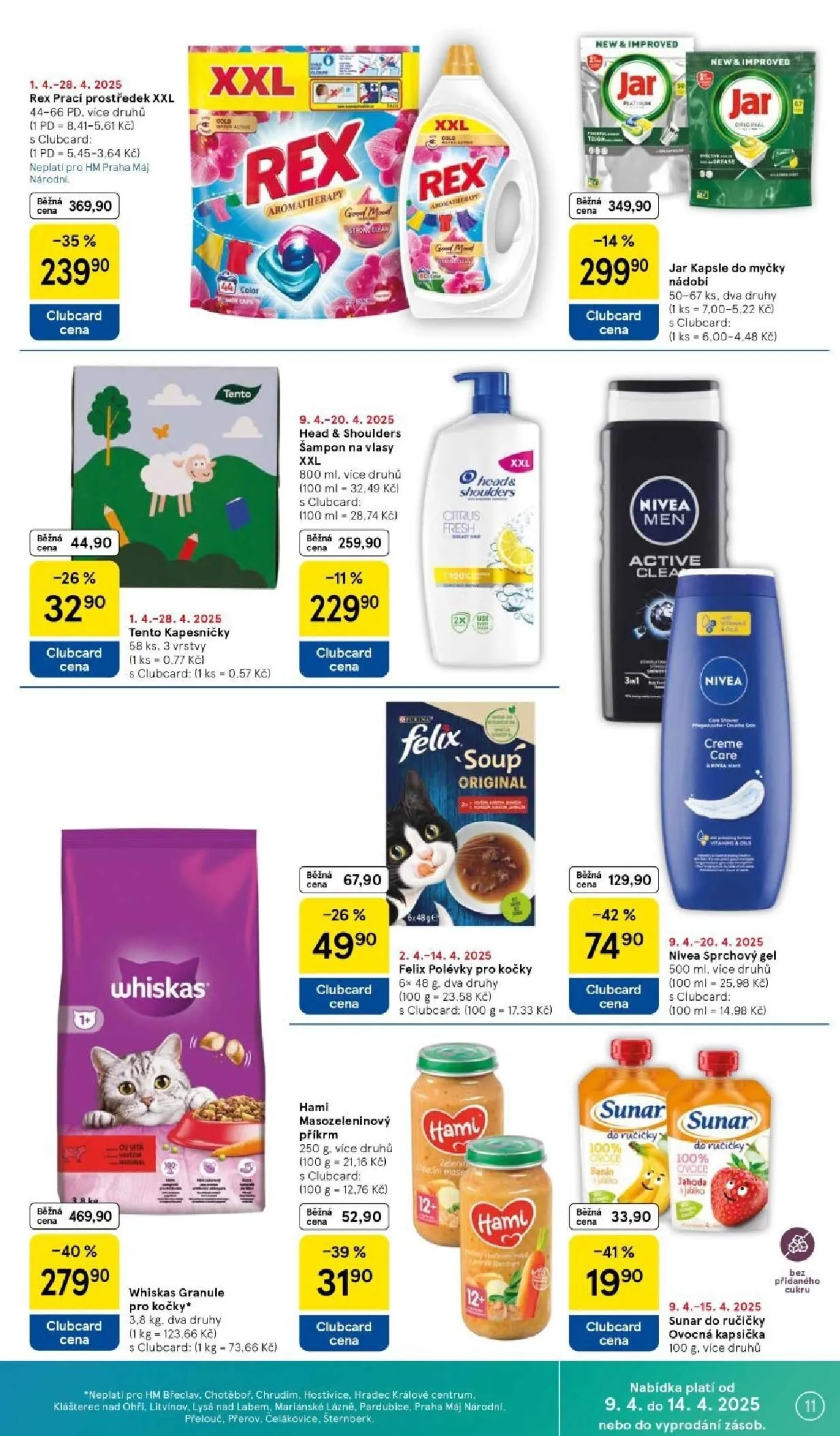 V letáku obchodu Tesco najdete širokou nabídku produktů se slevami a speciálními cenami. Například prací prostředek Rex v XXL balení je nyní za cenu 239,90 Kč, což představuje slevu 35 %. Dále si můžete pořídit Jar kapsle do myčky za 299,90 Kč, nebo šampon Head & Shoulders za 329,90 Kč.