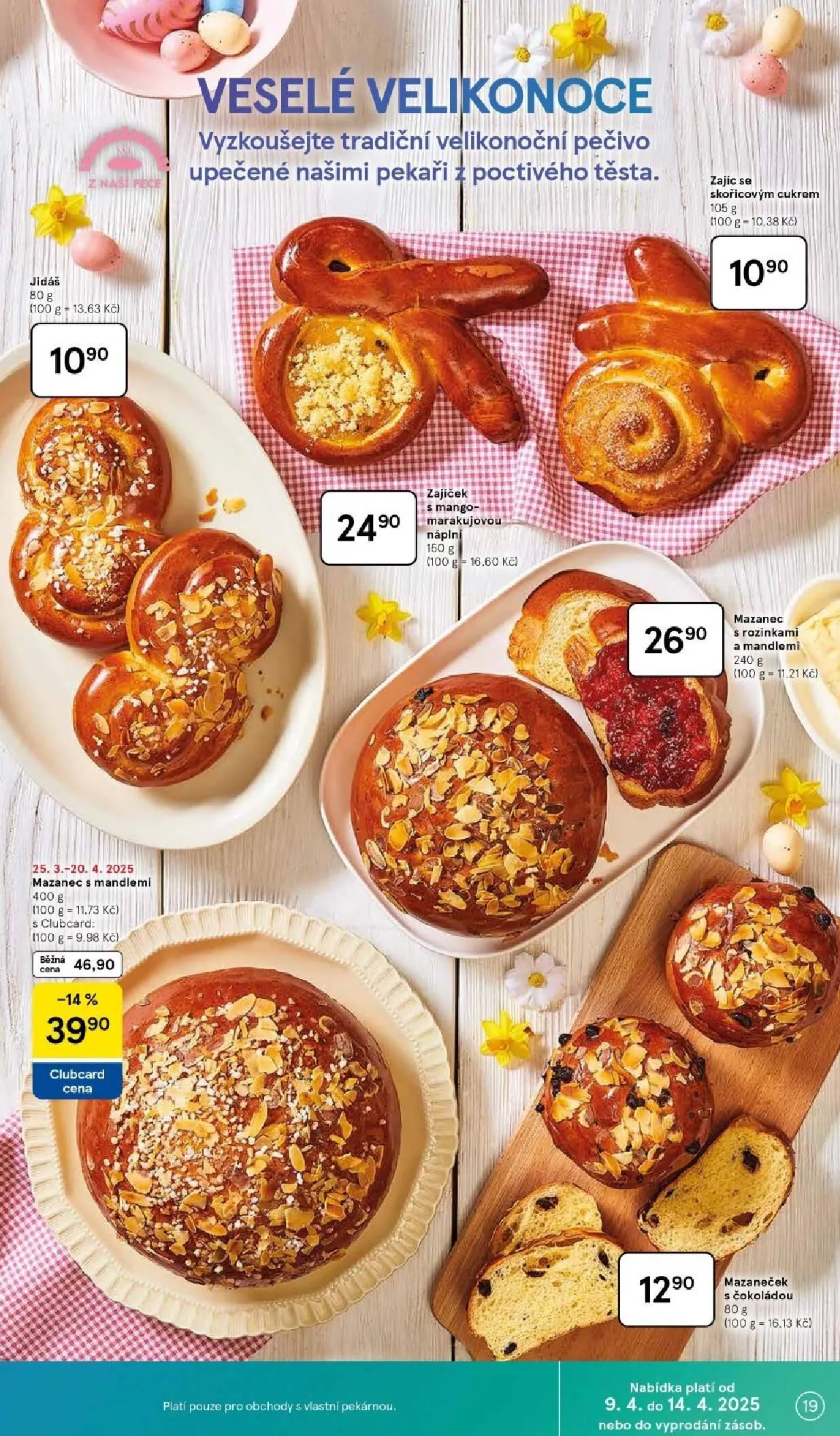 V letáku obchodu Tesco najdete širokou nabídku tradičního velikonočního pečiva, které potěší každého milovníka sladkostí. Mezi nabízenými produkty je mazanec s mandlemi (400 g) za cenu 39,90 Kč, nyní se slevou 14 %. Dále si můžete vychutnat zajíčka s mango-marakujovou náplní (105 g) za 26,90 Kč nebo zajíčka se skořicovým cukrem (105 g) za 10,90 Kč. Nezapomeňte také na mazanec s rozinkami a mandlemi (240 g) za 26,90 Kč. Všechny produkty jsou pečeny našimi pekaři z poctivého těsta. Nabídka platí od 9. 4. do 14. 4. 2025 nebo do vyprodání zásob.