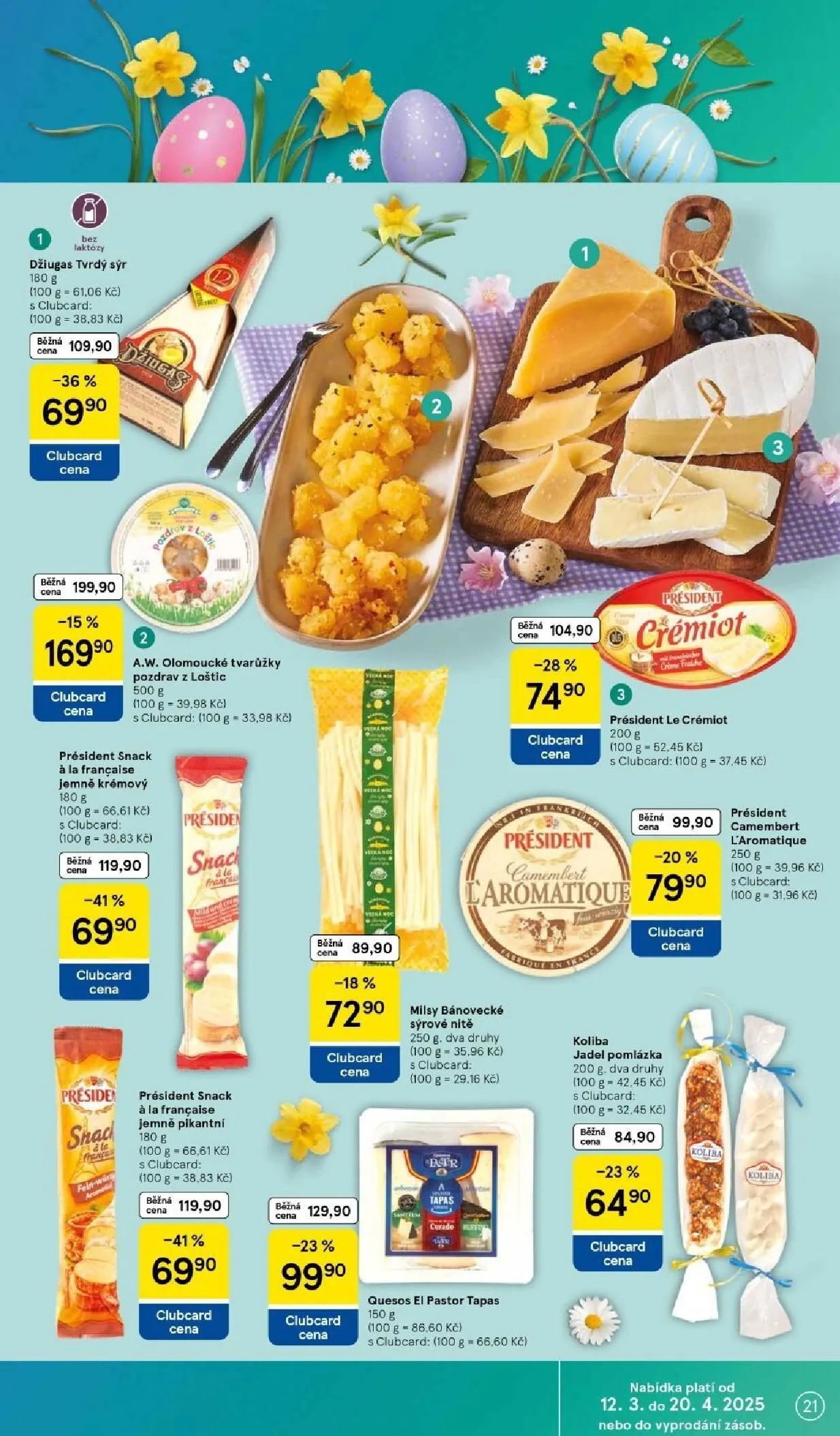 Nezapomeňte také na sýrové nitě Milsy, které jsou k dostání za 35,96 Kč za 100 g, a pikantní Président snack á la française. Všechny ceny jsou uvedeny s Clubcard s výraznými slevami. Nabídka platí od 12. 3. do 20. 4. 2025 nebo do vyprodání zásob. Nepropásněte tuto skvělou příležitost!
