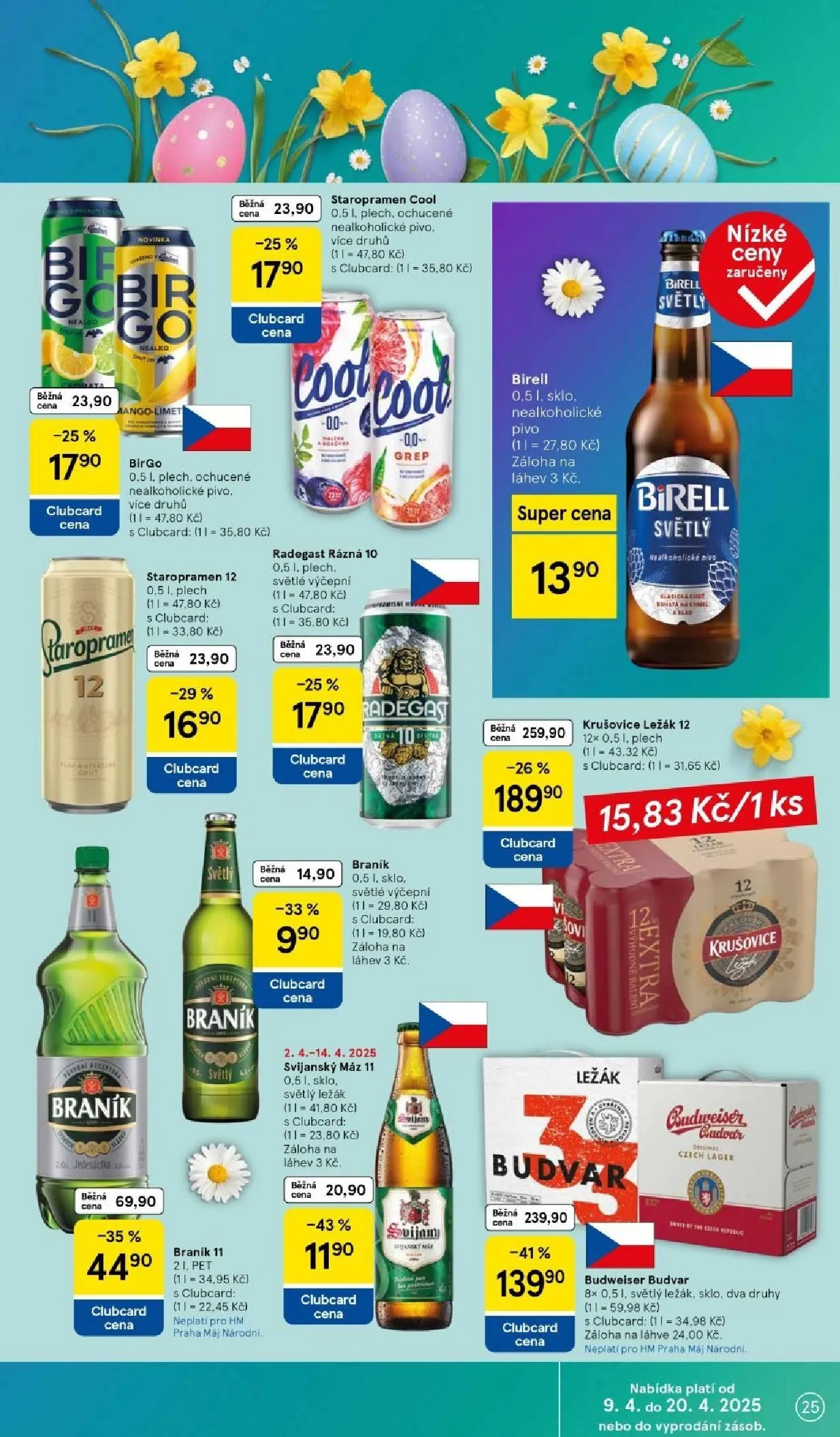 V letáku obchodu Tesco najdete širokou nabídku nealkoholických a alkoholických nápojů za skvělé ceny. Například Staropramen 12° v plechovce je nyní za 23,90 Kč s 25% slevou, a s clubcard dokonce za 35,80 Kč. Dalšími lákadly jsou Birell v plechovce, který je k dostání za 23,90 Kč s 29% slevou, nebo Braník 11° v PET lahvi za 14,90 Kč, což představuje 33% slevu.
