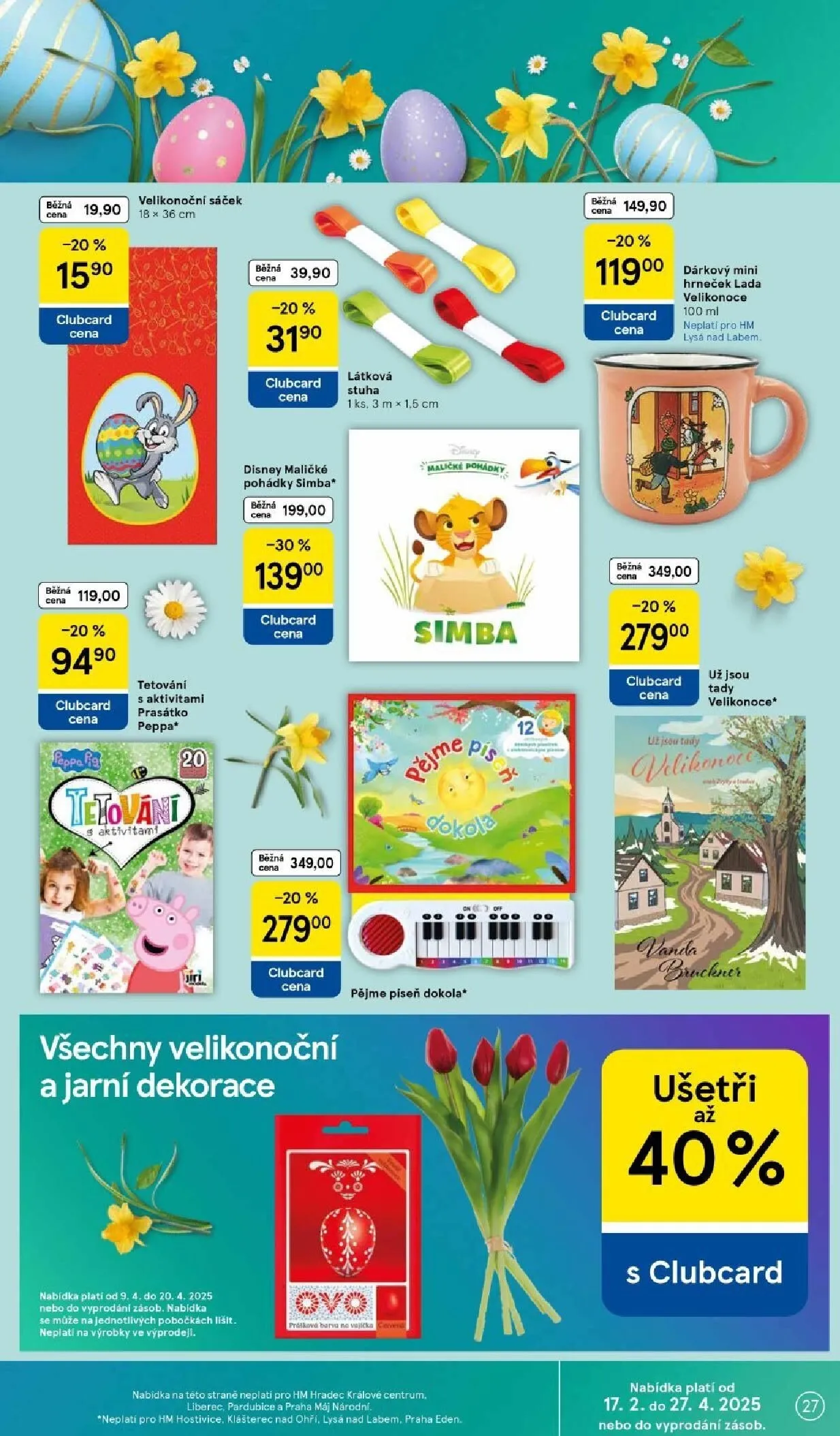 V letáku obchodu Tesco najdete širokou nabídku velikonočních a jarních dekorací. Například velikonoční sáček s motivem prasátka Pepy za cenu 39,90 Kč, nyní se slevou 20 % na 31,90 Kč. Dále nabízíme dárkový mini hrneček s motivem Lada za 149,90 Kč, po slevě 20 % za 119,00 Kč. Nezapomeňte také na látkovou stuhu o rozměrech 3mx1,5cm, která je nyní za 39,90 Kč, po slevě 20 % za 31,90 Kč. Všechny produkty jsou dostupné s Clubcard výhodami. Nabídka platí do 27. 4. 2025 nebo do vyprodání zásob. Ušetřete s námi na velikonočních nákupech!